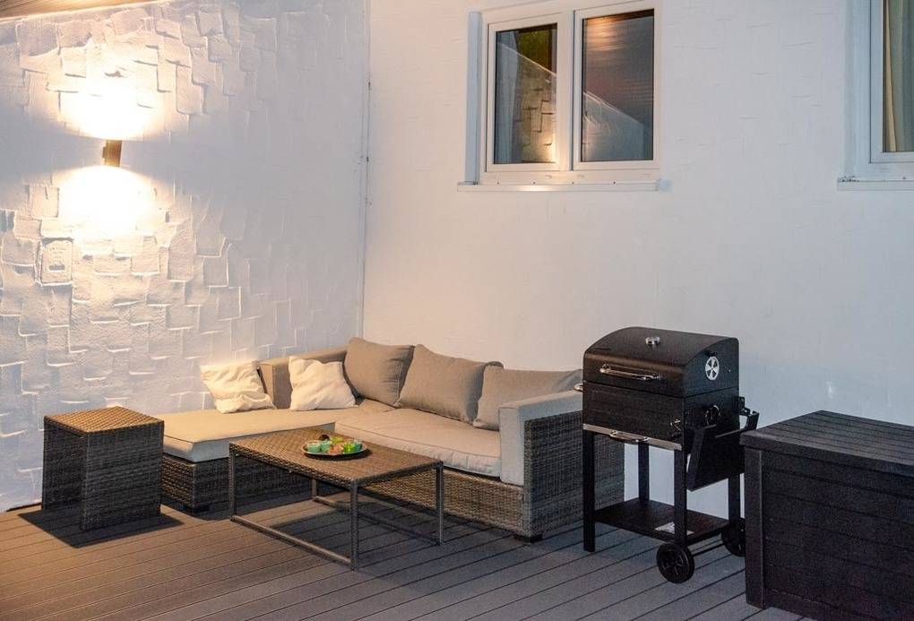 Die an das Wohnzimmer angeschlossene und mit bequemen Gartenmöbeln und einem Terrakottaofen ausgestattete Terrasse lädt mit ihrer Südlage ebenfalls zum Erholen oder zu entspannten Grillabenden ein.
