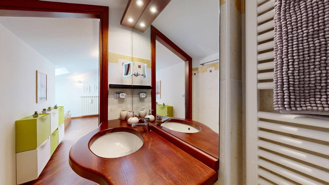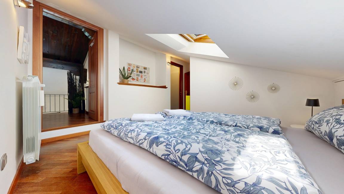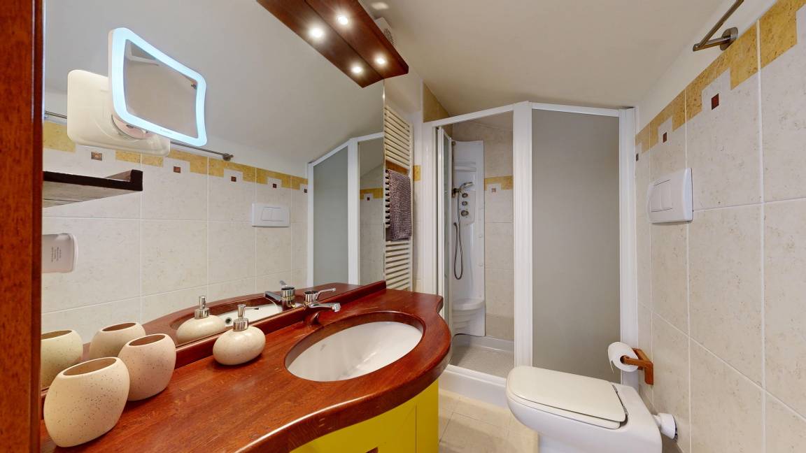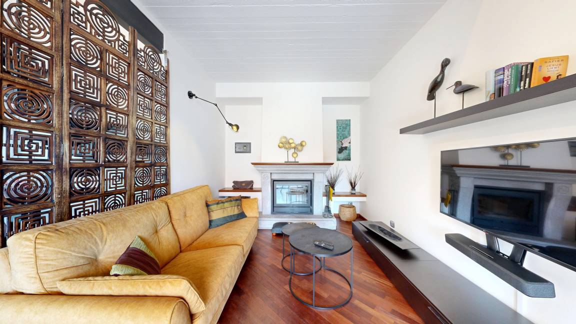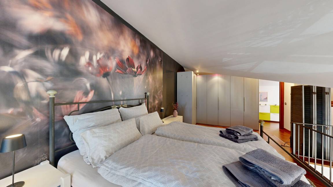 Der untere Bereich mit 54m² Wohnfläche ist offen gestaltet. Hier finden Sie eine geräumige, sehr gut ausgestattete, offene Küche, einen Essplatz für vier Personen sowie ein Wohnzimmer mit TV, einer bluetoothfähigen Soundbar und einem Feuerholzkamin für Behaglichkeit an kühlen Tagen. Große Glastüren führen auf zwei voneinander getrennte, nach Süden ausgerichtete Balkone. Ein Balkon ist mit Esstisch für vier Personen, der zweite an der Küche mit einem Beefer ausgestattet, in dem Sie nicht nur grillen, sondern auch Pizza backen können. Ebenso befindet sich auf dieser Ebene ein Bad mit Waschtisch, Bidet, Toilette, Badewanne und Waschmaschine. Über eine Freitreppe gelangen Sie auf die rund 35m² große zweite Ebene, auf der sich zwei Schlafzimmer, ein weiteres Bad mit Waschtisch, Dusche und Toilette sowie ein Arbeitsplatz mit Ladestation für sämtliche Endgeräte befinden, für den Fall, dass Sie ein Homeoffice betreiben müssen. Aufgrund der Freitreppe sowie der niedrigen Brüstung im offenen Schlafbereich, eignet sich die Wohnung nicht für Familien mit kleineren Kindern.