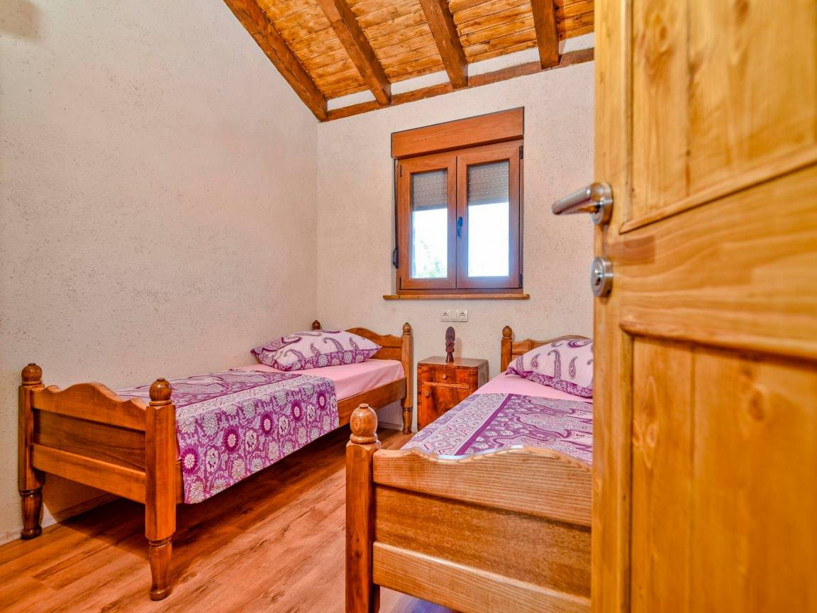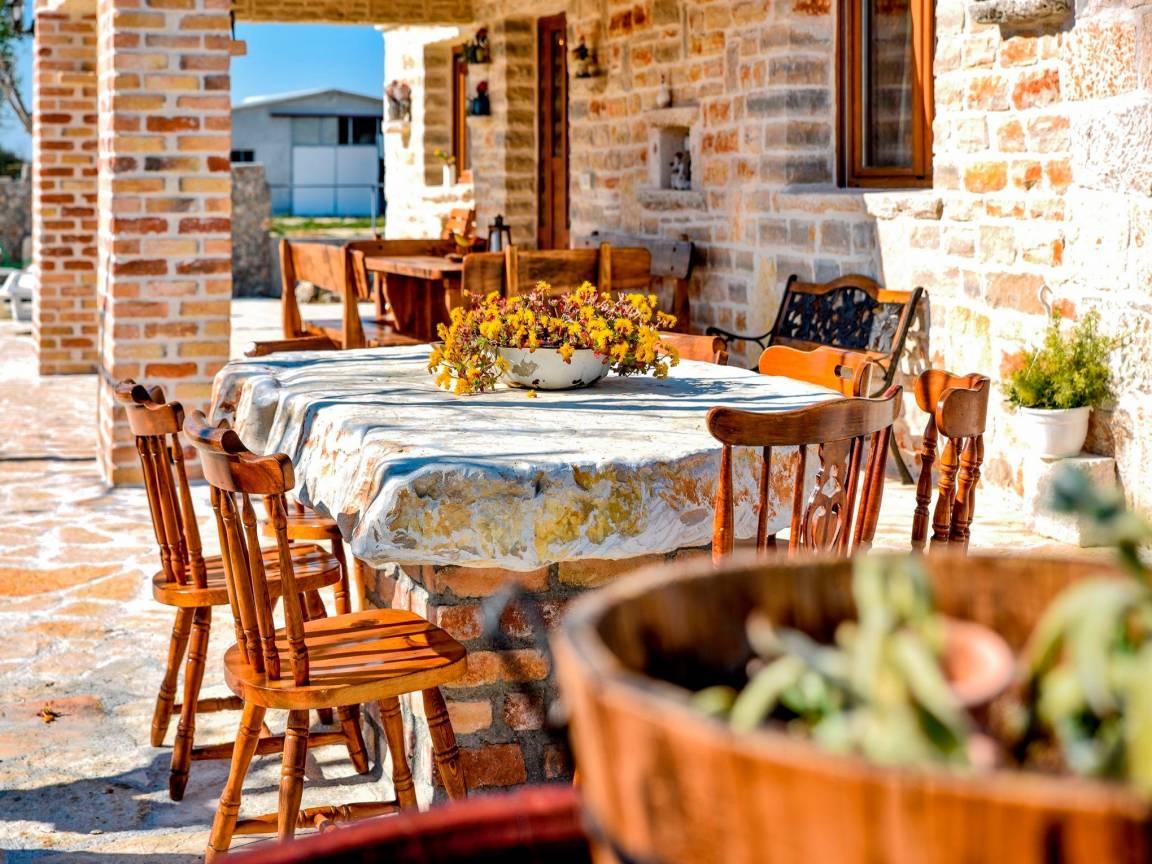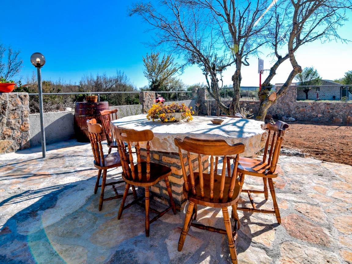 Der grosse Garten ist ummauert mit Stein. Im Garten ist auch eine private Taverne mit Grill nur für die Gäste. Gartenmöbel, Sonnenliegen und Pool. Das Haus hat eine grossen überdachte Terrasse mit Blick auf den Pool, wo man gemütlich Früschtücken kann.
