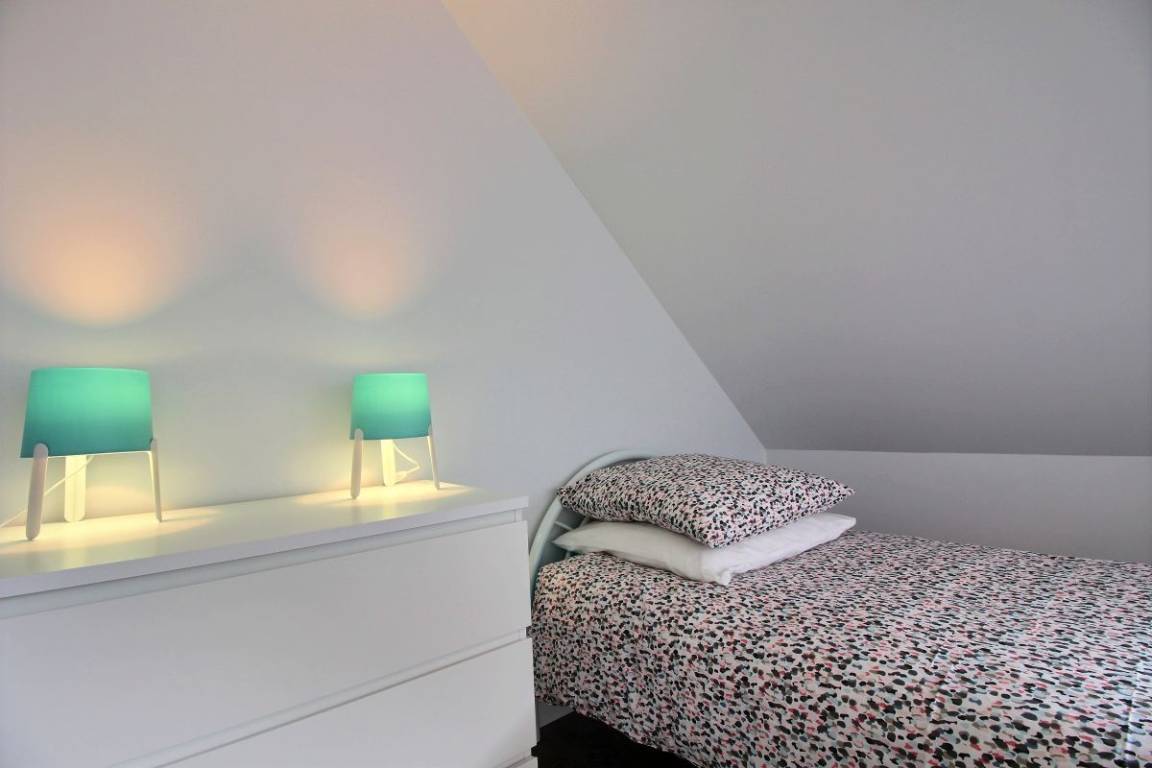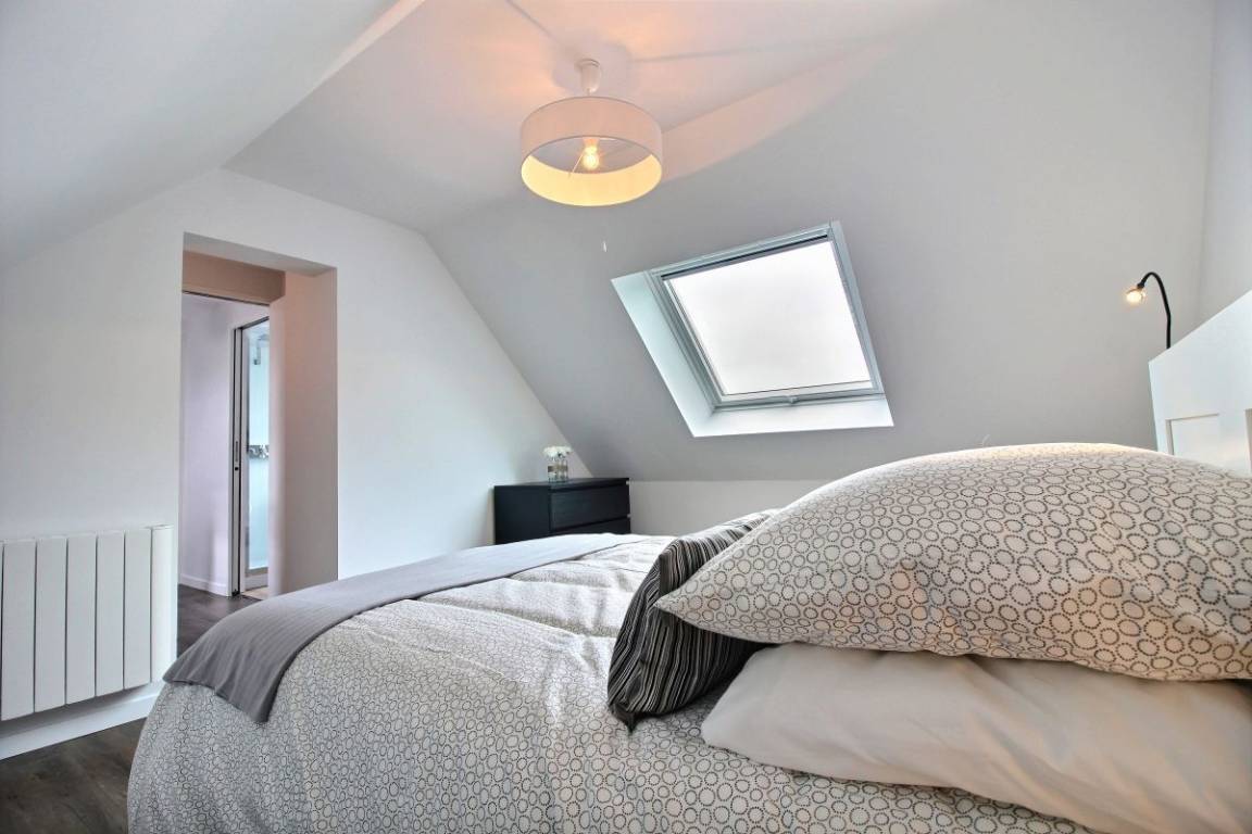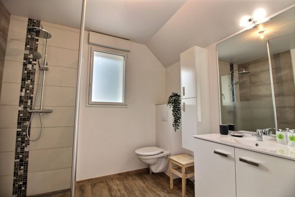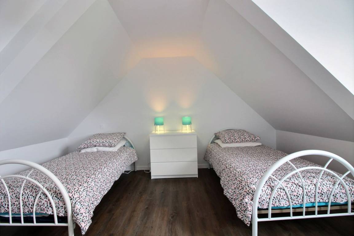 Im Obergeschoss: zwei Schlafzimmer (2 90x190-Betten und ein 140x200-Bett), eines davon mit einem kleinen Ankleidezimmer und einem Badezimmer mit WC.