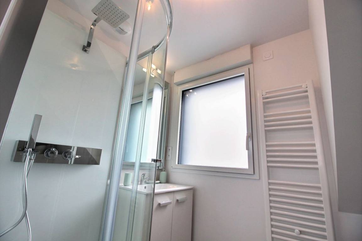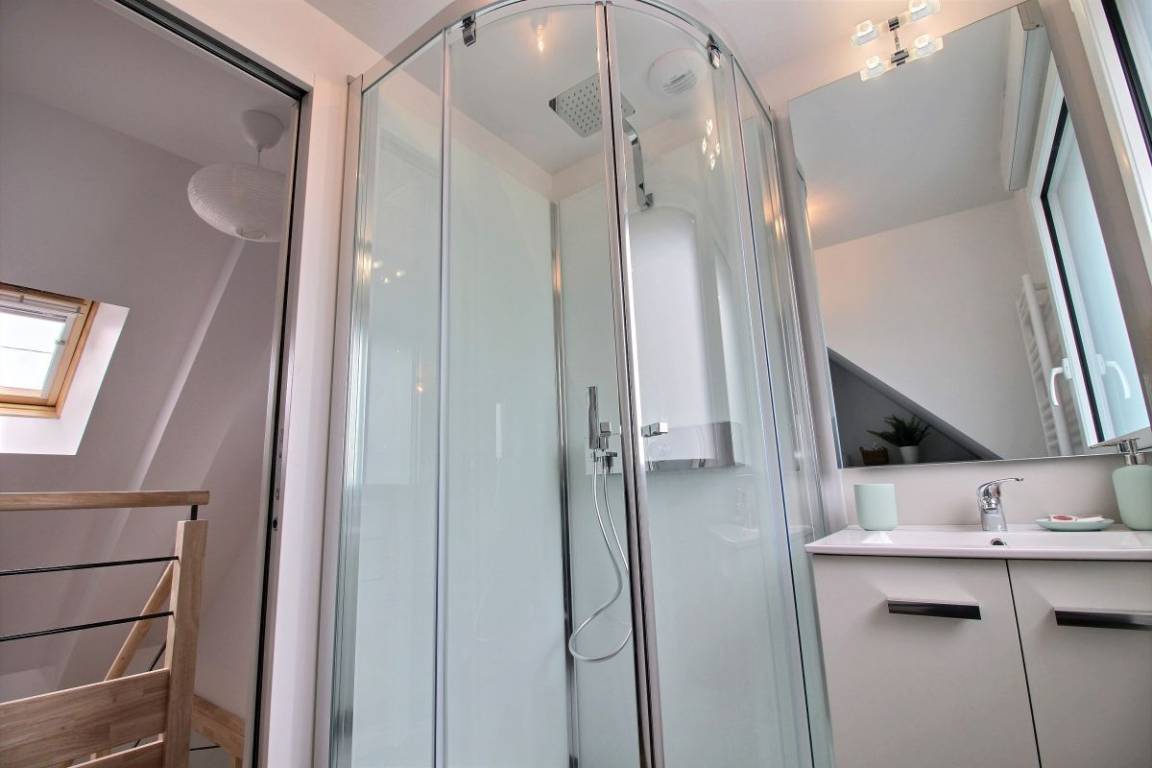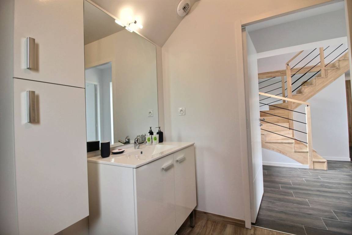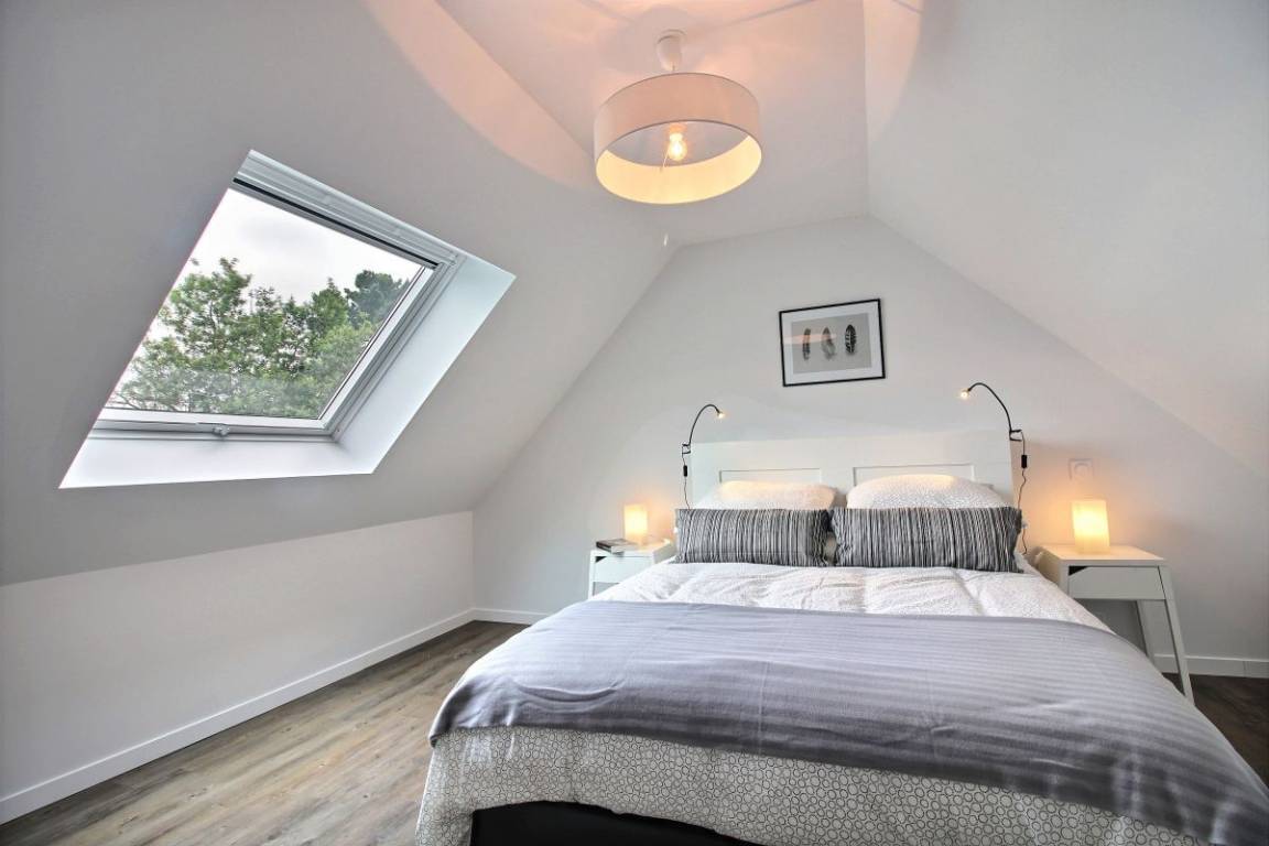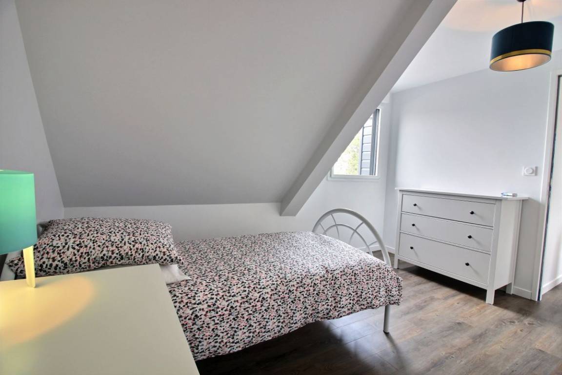Im Obergeschoss: zwei Schlafzimmer (2 90x190-Betten und ein 140x200-Bett), eines davon mit einem kleinen Ankleidezimmer und einem Badezimmer mit WC.