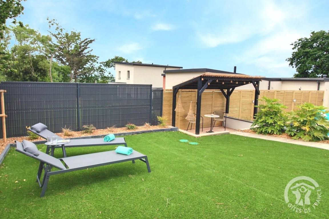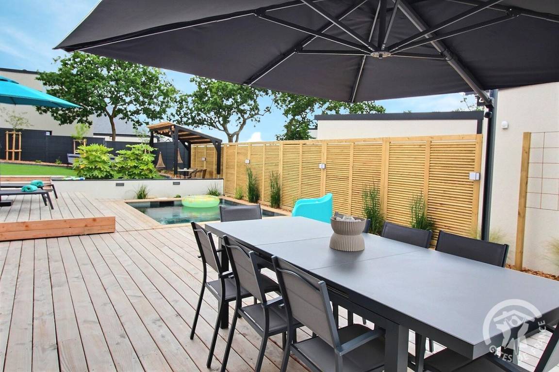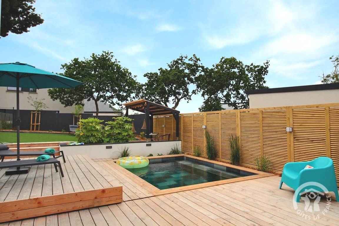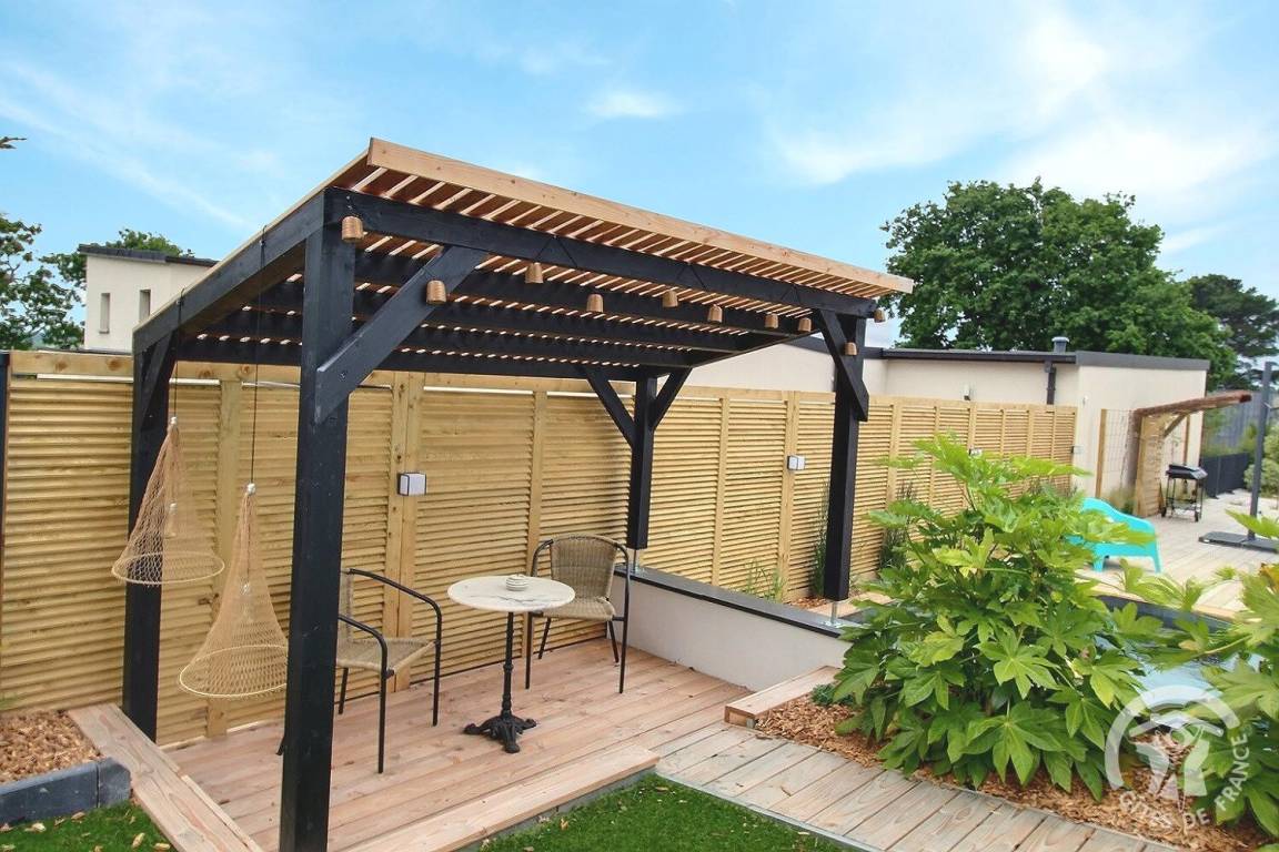 Holzterrasse sowie eine weitere verschiebbare Terrasse auf Schienen, die sich zu einem beheizten Pool von 10 m² (3 x 4 m) und 1,5 m Tiefe öffnet, verfügbar von April bis Oktober. Kunstrasen von 150 m². Parken für 2 Fahrzeuge auf dem Privatparkplatz mit Carport am Eingang Ihrer Mietwohnung. Eine Garage zum Abstellen Ihrer Fahrräder und Motorräder.