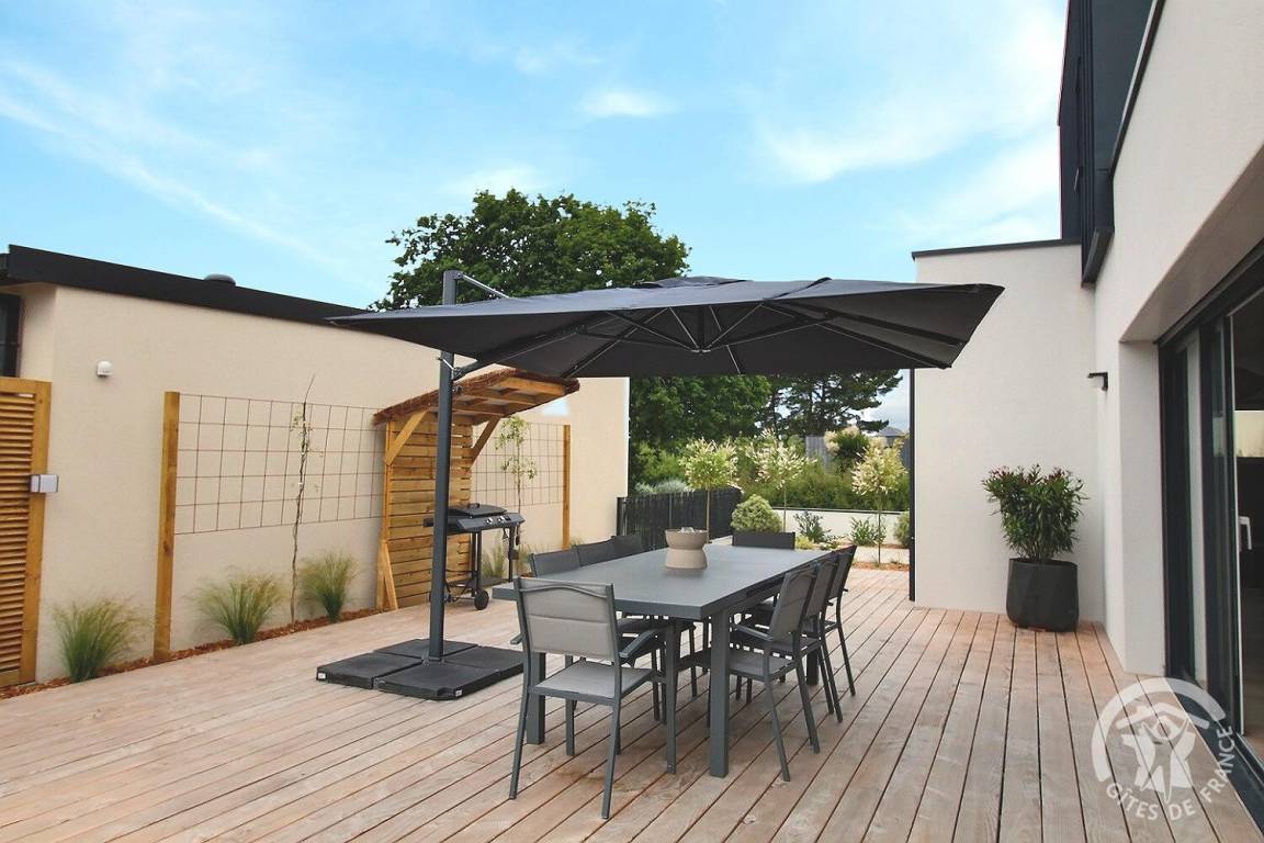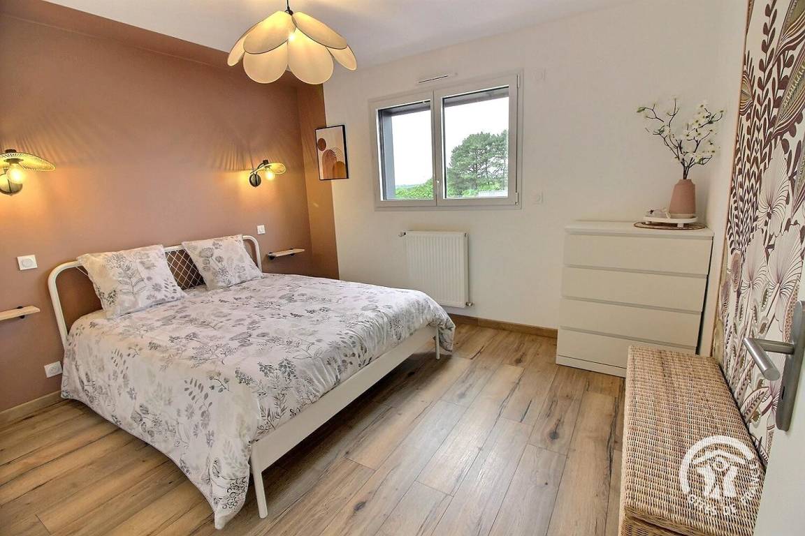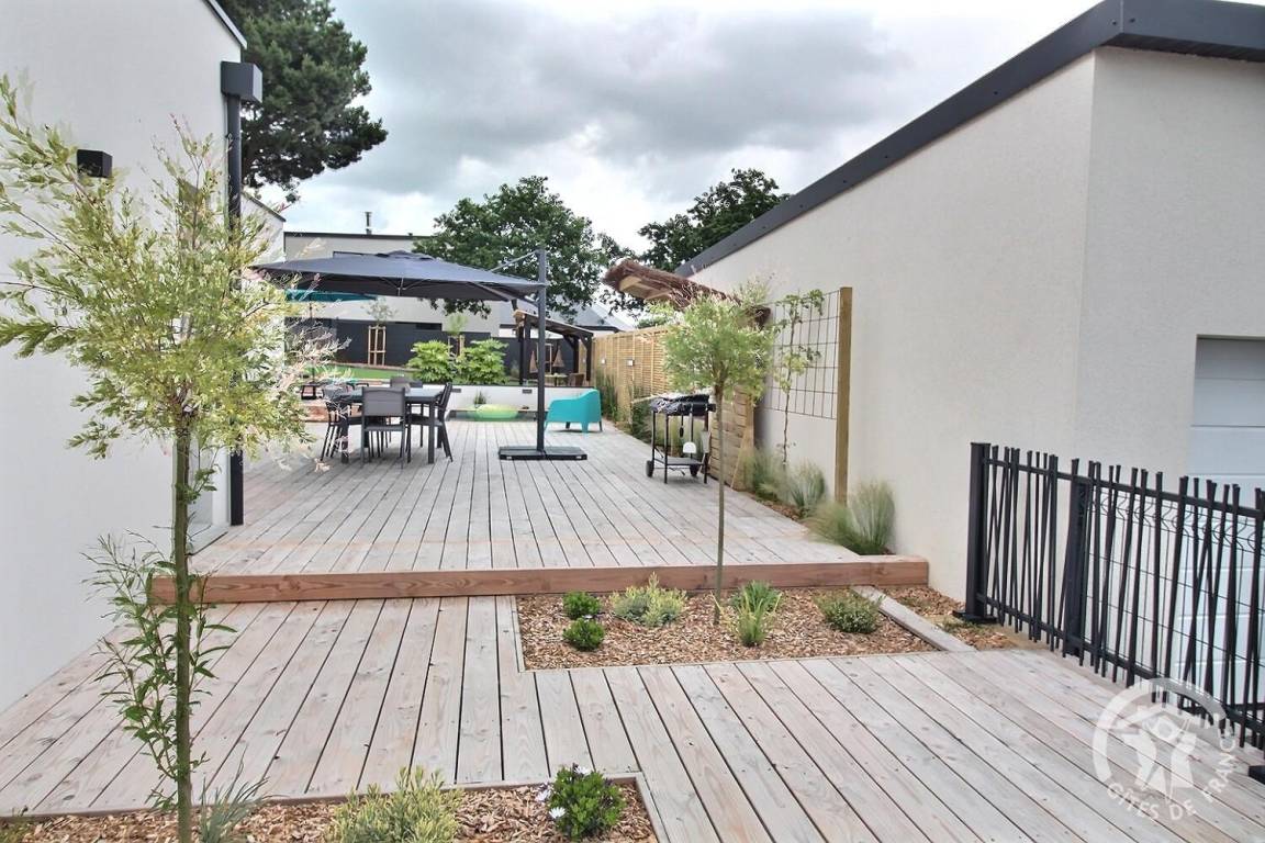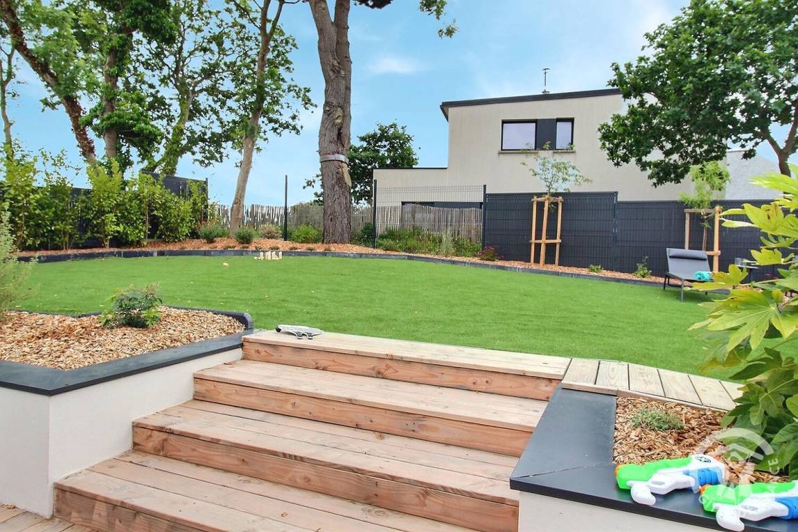 Holzterrasse sowie eine weitere verschiebbare Terrasse auf Schienen, die sich zu einem beheizten Pool von 10 m² (3 x 4 m) und 1,5 m Tiefe öffnet, verfügbar von April bis Oktober. Kunstrasen von 150 m². Parken für 2 Fahrzeuge auf dem Privatparkplatz mit Carport am Eingang Ihrer Mietwohnung. Eine Garage zum Abstellen Ihrer Fahrräder und Motorräder.