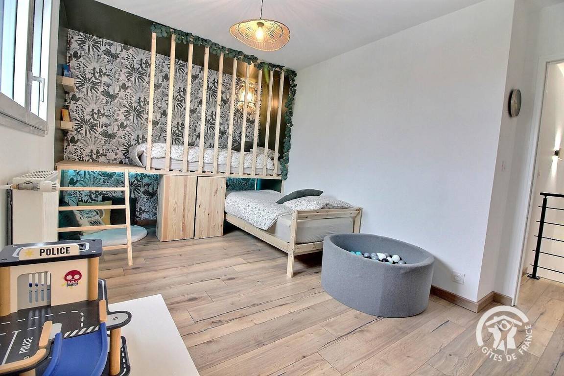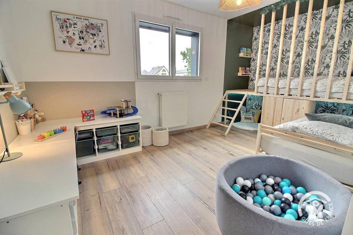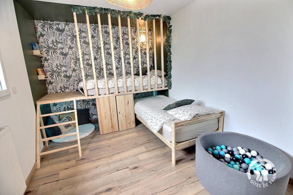 Das hübsche Hüttenzimmer im Obergeschoss bietet Ihren Kindern einen gemütlichen Rückzugsort, in dem sie ihrer Fantasie freien Lauf lassen können. Es ist ihr eigener Raum, in dem sie schlafen, lesen und spielen können.