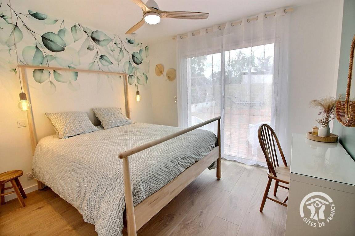 Ein Schlafzimmer mit einem 160x200 Bett und direktem Zugang zur Terrasse