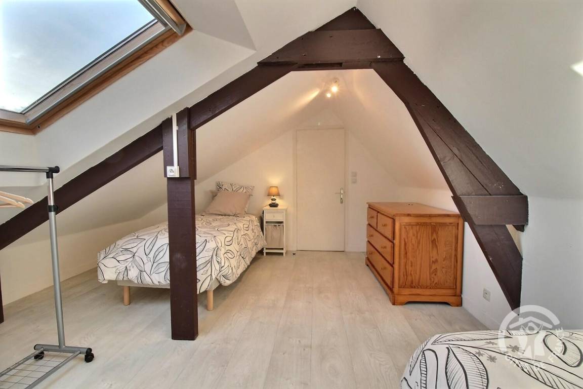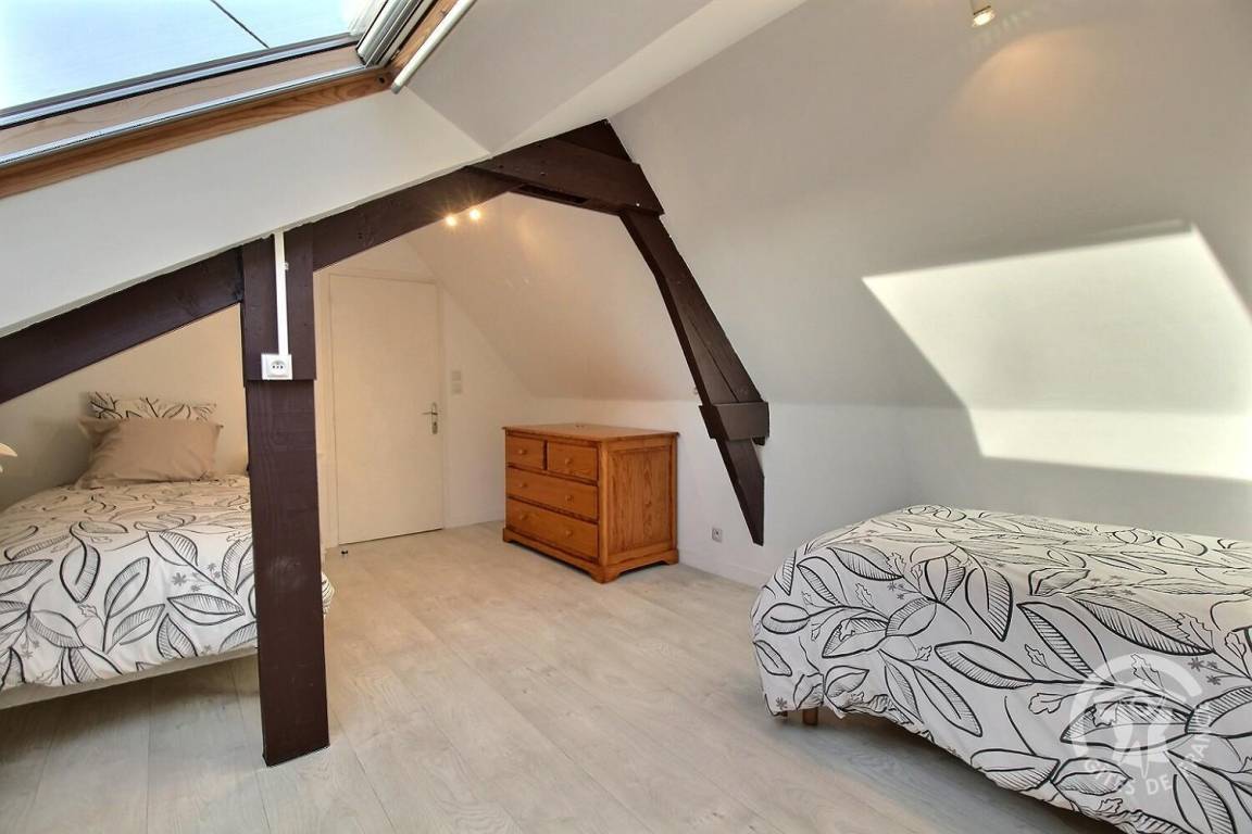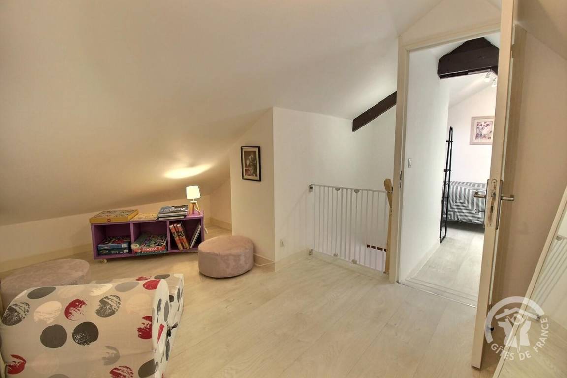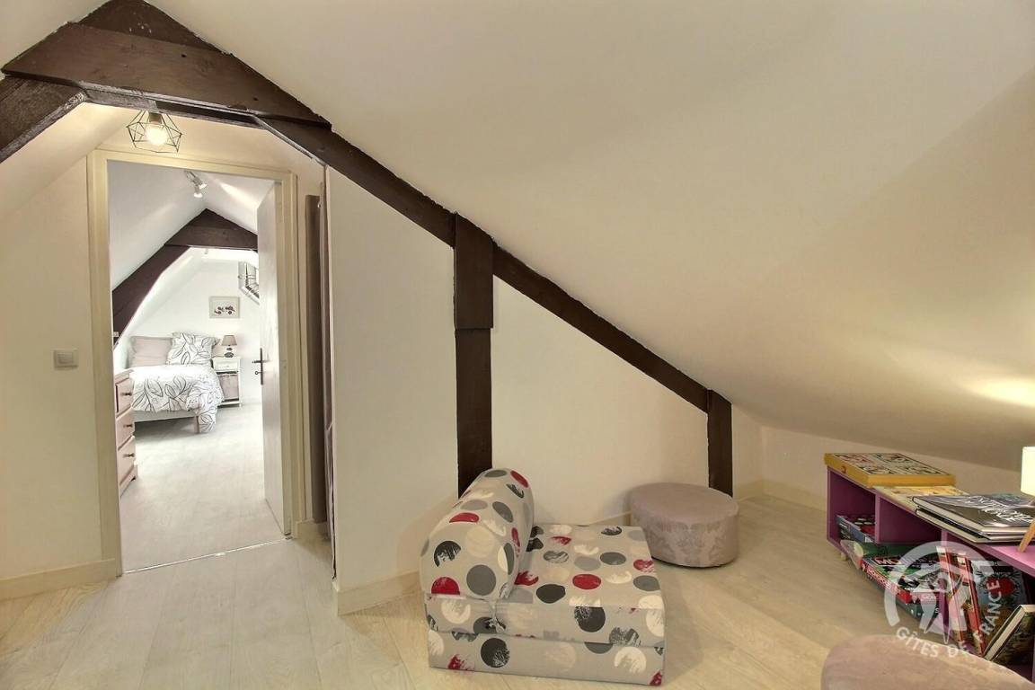 Dachgeschossflur mit Spielbereich für Kinder, 1 großes Schlafzimmer im Dachgeschoss (1 90x190-Bett), 1 kleines Schlafzimmer (1 90x190-Bett).