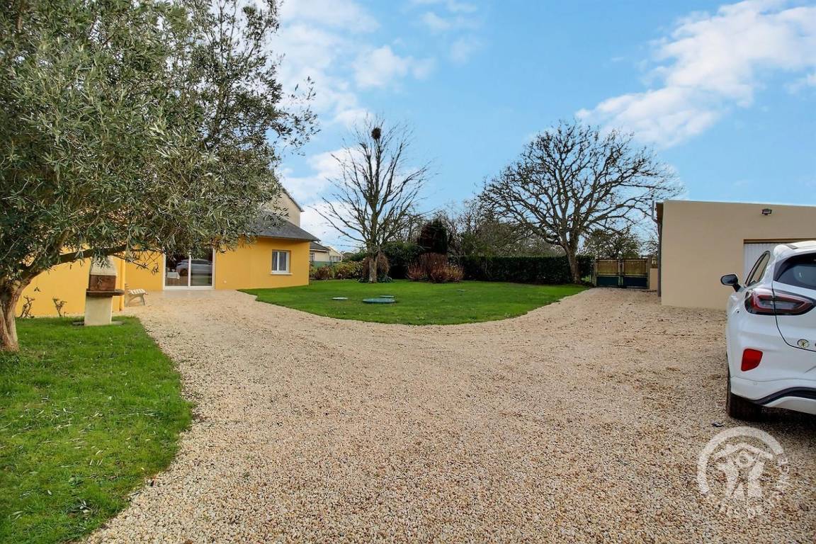 Terrasse, großer Kieshof von 200 m² zum Parken, eingezäunter Landschaftsgarten von 300 m².