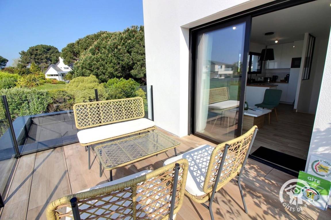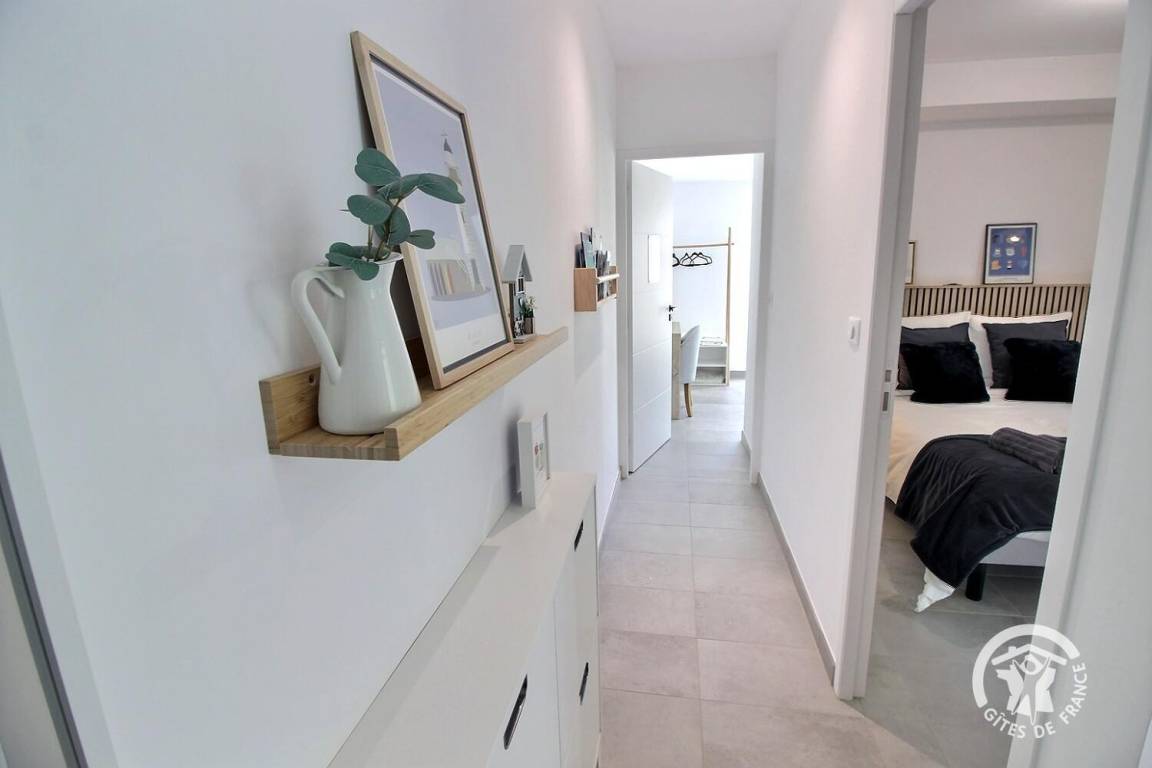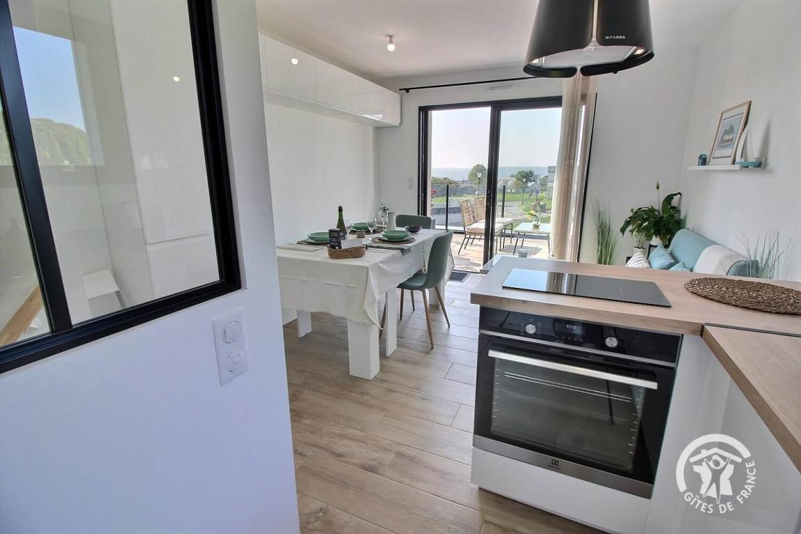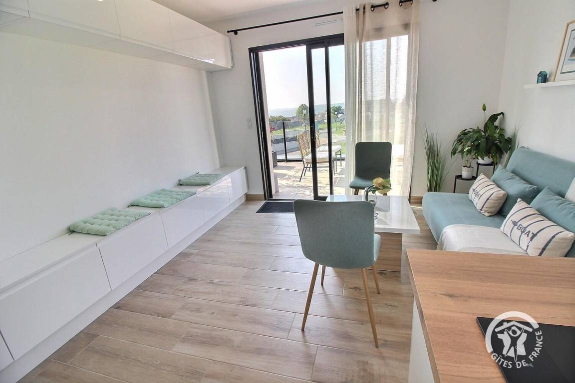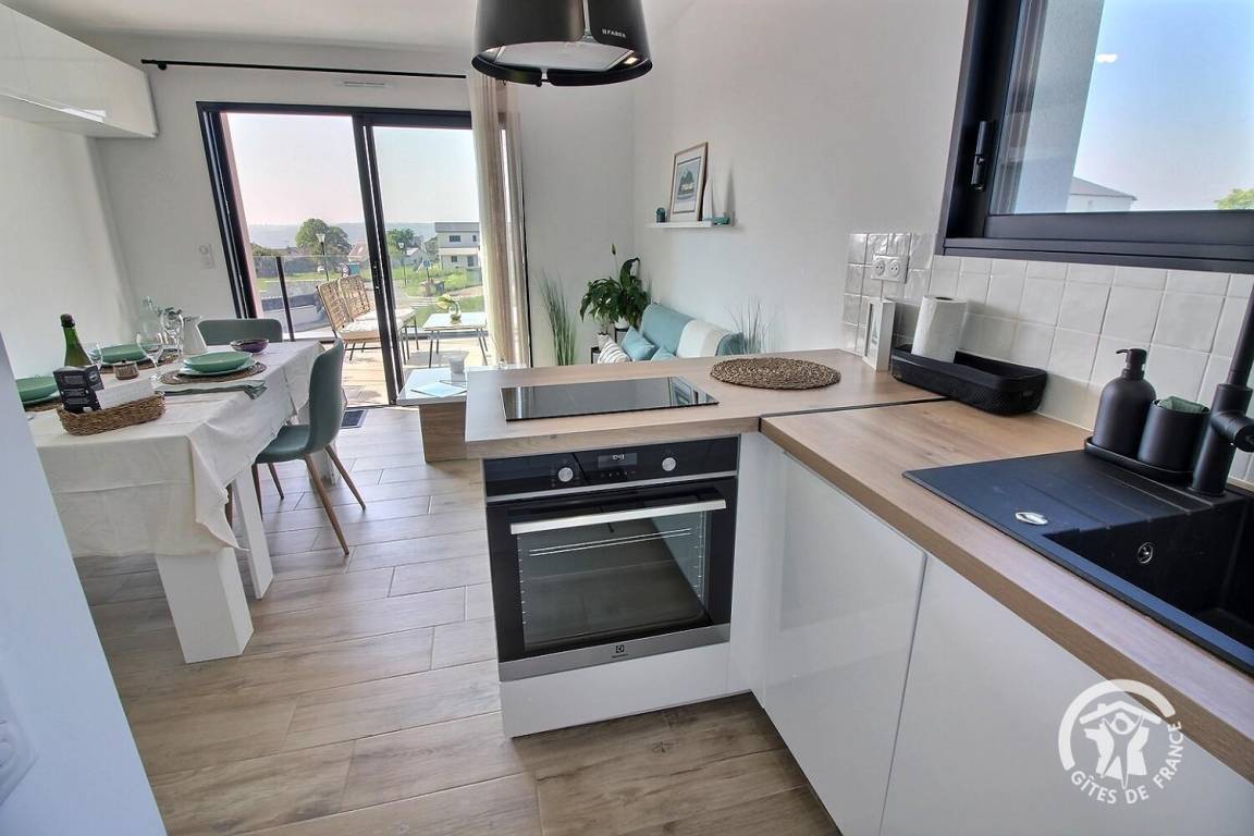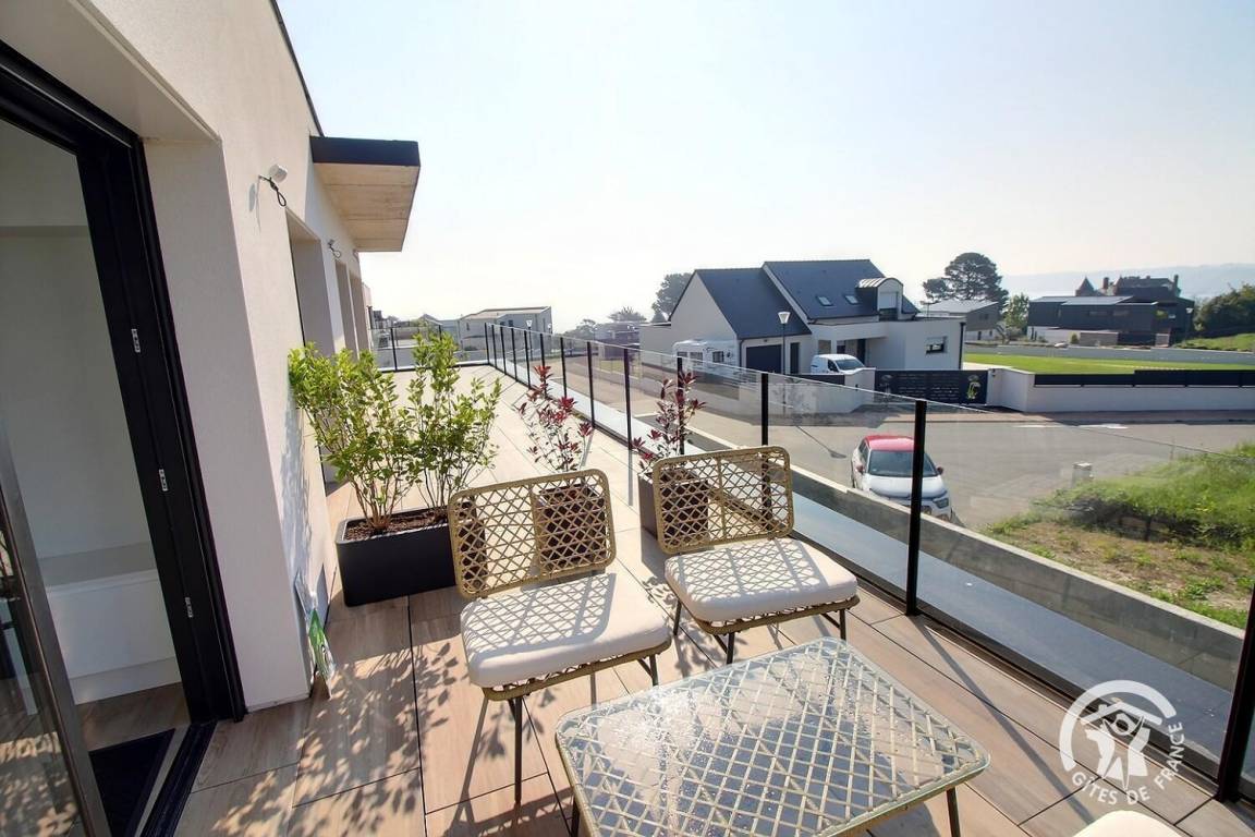 „Superbe séjour, très belle vue mer du balcon. Petite attention lors de l'arrivée. Appartement petit mais bien agencé et avec beaucoup de rangement et décoré avec goût. Le parking devant la porte est un plus. Il manque juste des rideaux dans les chambres qui sont au rdc. Nous recommandons ce gîte.“