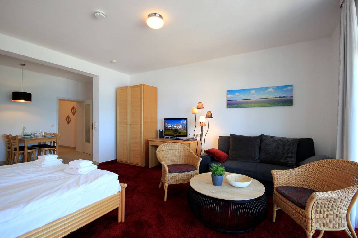 Ihre 1-Zimmer Ferienwohnung 225RB21 befindet sich im 2. Obergeschoss, ist ca. 45 qm groß und für bis zu 4 Personen gut geeignet. Neben dem kombinierten Wohn- und Schlafraum mit Doppelbett sowie Schlafsofa, auf dem die 3. und 4. Person gut schlafen können, gehört ein Essbereich, Flachbild TV sowie WLAN zur Nichtraucherwohnung. Vom überdachten Balkon haben Sie einen wundervollen Meerblick. Ebenfalls können Sie eine voll ausgestattete integrierte Küchenzeile mit Geschirrspüler, Nespresso-Maschine, Backofen, Mikrowelle, Wasserkocher, Toaster und Kaffeemaschine nutzen. Das Badezimmer erwartet Sie mit Waschtisch, WC und Dusche. Haustiere sind herzlich willkommen. Ein PKW-Stellplatz für Ihren PKW ist direkt am Haus vorhanden.