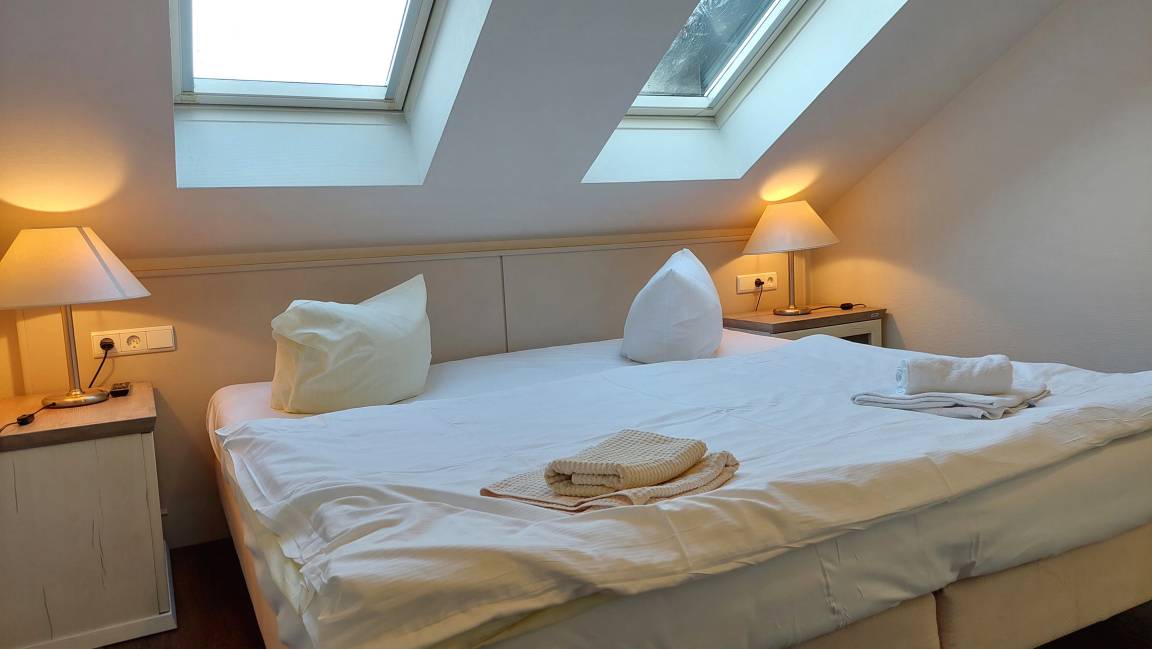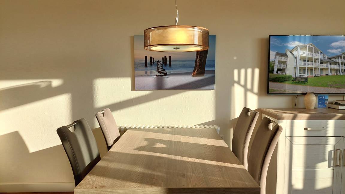 Der Wohn- und Essbereich beherbergt eine moderne Küchenzeile mit Ceran-Kochfeldern, einem Geschirrspüler, einem Kühlschrank mit Gefrierfach, einer Mikrowelle und verschiedenen Küchenutensilien. Der Essbereich bietet sogar Platz für 4 Personen und eine gemütliche Sitzlandschaft lädt zum Verweilen ein. Zur technischen Ausstattung gehören kostenfreies WLAN, ein Smart-TV samt Blu-ray-Player und eine kleine Musikanlage.