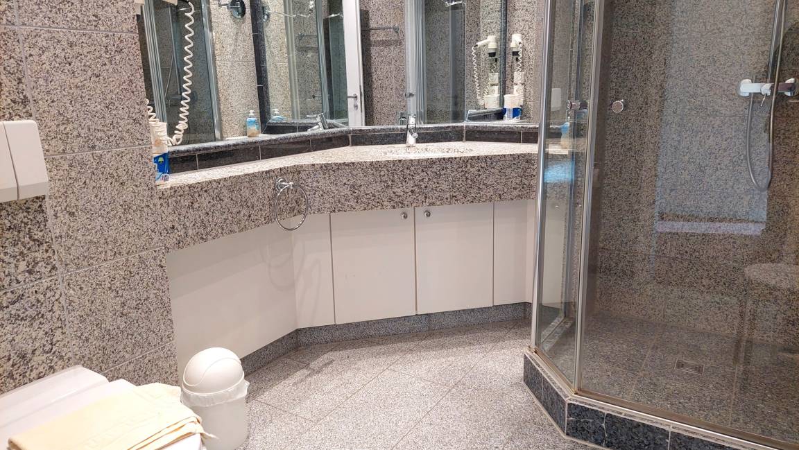 Das Badezimmer ist in Marmoroptik gehalten und verfügt über eine Toilette, einen Waschtisch, eine Dusche, einen Kosmetikspiegel, Fön und Zugang zum Ankleidezimmer mit viel Stauraum.