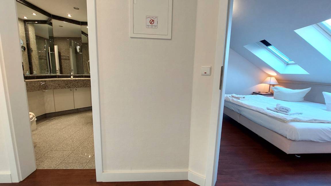Von dort aus gelangen Sie auch ins Schlafzimmer, welches mit einem Doppelbett und einem zusätzlichen TV ausgestattet ist.