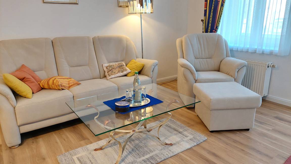 Die Ferienwohnung ist aufgeteilt in einen gemütlichen Wohnraum mit Sitzgruppe und Schlafsofa, Flachbild-TV, Radio mit CD Player, ein Schlafzimmer mit einem Doppelbett und großem Kleiderschrank und einem zweiten separaten Schlafzimmer / Kinderzimmer mit einem Einzelbett. Die moderne Küche ist mit Ceran-Einbauherd, Geschirrspülmaschine, Mikrowelle, Kaffeemaschine, Wasserkocher und diversen anderen Küchenhelfern perfekt ausgestattet. Das Tageslichtbad bietet neben Dusche, Waschtisch und WC auch ein Handtuchheiztrockner und ein Kosmetikspiegel. Die Wohnung hat dazu noch einen separaten Abstellraum.