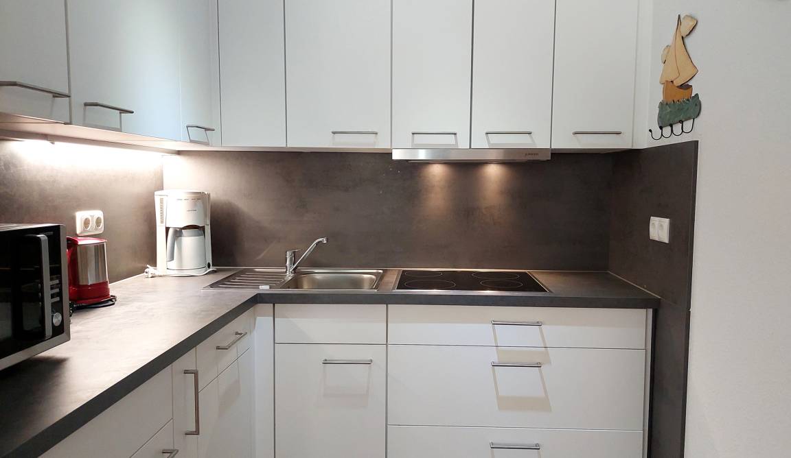 Diese verfügt über einen Geschirrspüler, Kühlschrank (mit Gefrierfach), Kaffeemaschine, Wasserkocher, Toaster und eine Microwelle mit Aufbackfunktion.
