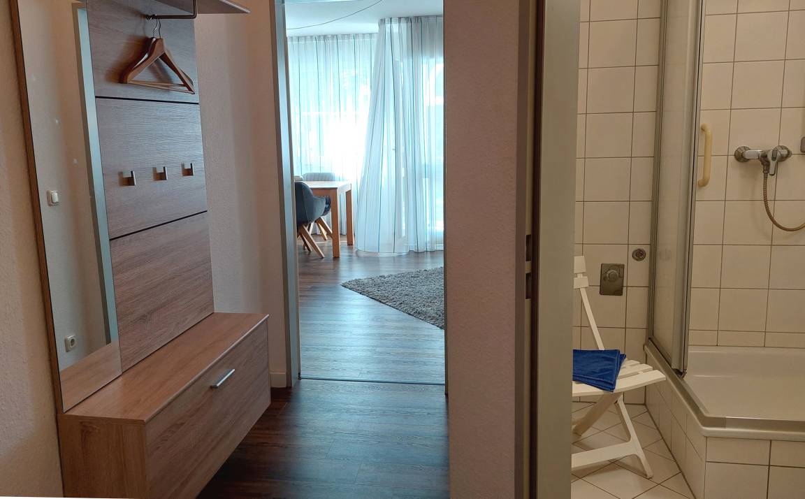 Das Badezimmer ist mit Dusche, WC, Fön und Kosmetikspiegel ausgestattet.