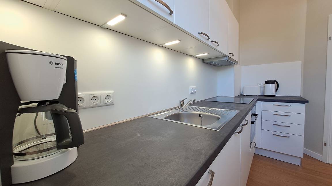 Separate Küche, ausgestattet u.a. mit Spülmaschine, Kühlschrank, Cerankochfeld mit Backofen, Mikrowelle, Kaffeemaschine, Wasserkocher und Toaster. Tisch mit 2 Stühlen