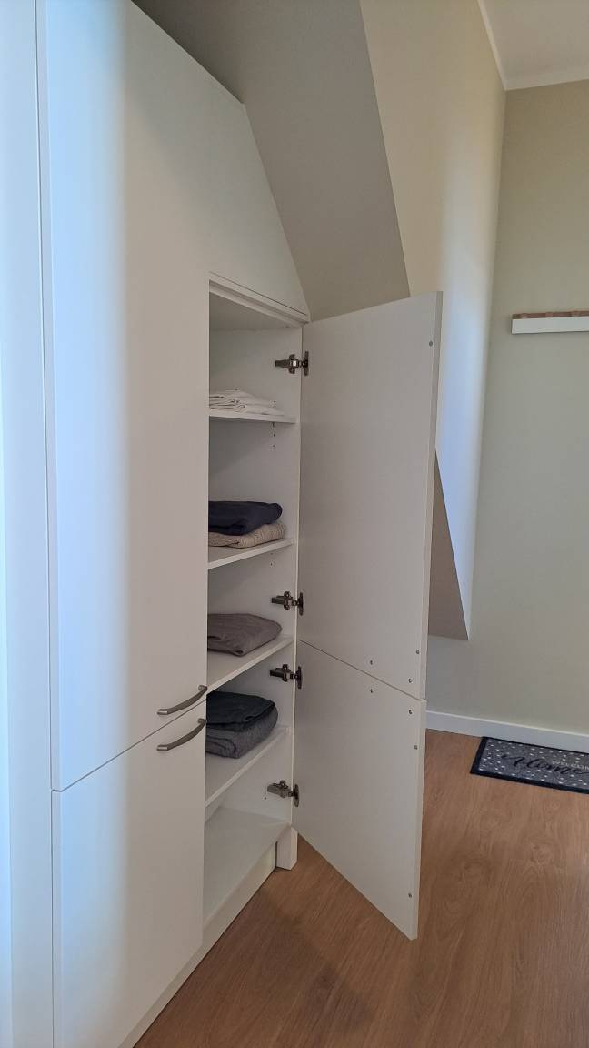 Flurschrank mit Putzutensilien und Staubsauger. Außerdem befindet sich im Flur ein Schrank mit Regaleinheiten, in welchem Sie Ihre Kleidung unterbringen können.