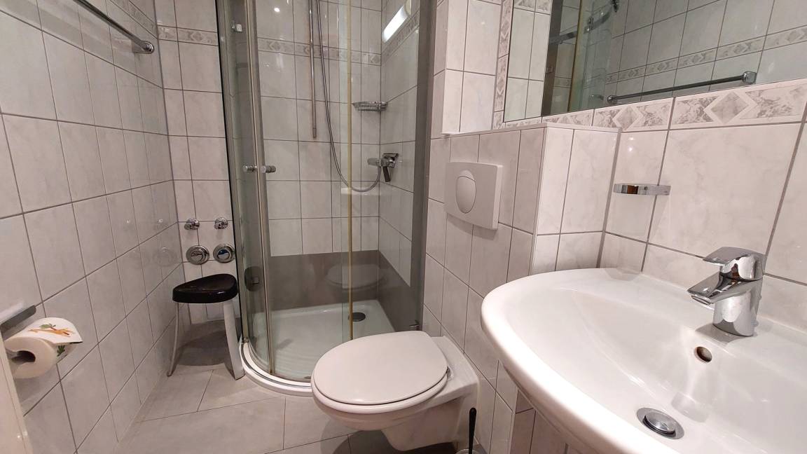Das Badezimmer verfügt über WC, Dusche, Kosmetikspiegel und Föhn.
