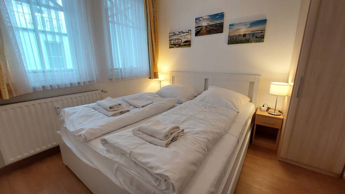 Im Schlafzimmer befindet sich ein Doppelbett samt Nachtischen und ein Kleiderschrank.