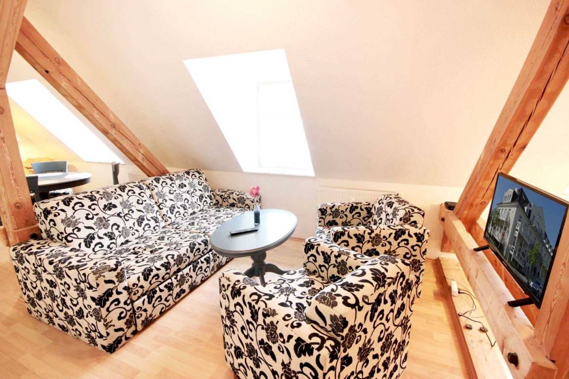 Im 2. Obergeschoss befindet sich der gemütliche Wohnraum mit angrenzender Wohnküche, dem Essbereich sowie das separate Duschbad. Im Wohnbereich gibt es eine schöne Sitzecke mit Sesseln, ein Flachbildfernseher sowie einen kostenfreien WLAN-Zugang. Die Küchenzeile ist ausgestattet mit Geschirrspüler, Backofen, Ceranfeld, Kühlschrank, Mikrowelle, Kaffeemaschine, Wasserkocher und Toaster. Das Bad verfügt über eine Dusche, einen Waschtisch und WC. Über die Wendeltreppe gelangen Sie in das 3. Obergeschoss direkt in das geräumige Schlafzimmer.