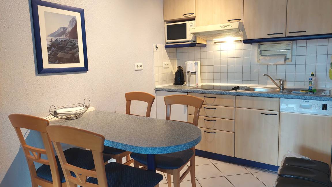 Die Wohnküche beinhaltet u.a. einen Geschirrspüler, Kochfeld, Mikrowelle, Kaffeemaschine, Wasserkocher und Toaster. Unsere Gäste können einen kostenfreien WLAN-Zugang nutzen.