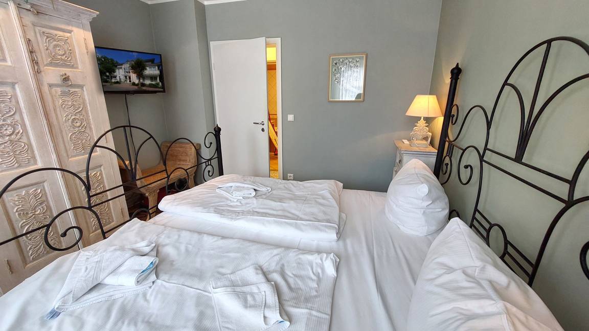 Ihre Ferienwohnung 24RB15 befindet sich im 2. Obergeschoss des Hauses. Von Wohnung und Balkon können Sie teilweise auf die Ostsee schauen. Die sehr schön in moderner Vintageoptik eingerichtete 2 Raum Wohnung ist ca. 55 qm groß und für 2 Personen eingerichtet. Das Wohnzimmer teilt sich auf in Sitzgruppe, Essplatz und Küchenzeile. Diese ist u.a. mit Ceranfeld, Geschirrspüler, Kühlschrank und Mikrowelle ausgestattet. Von hier aus können Sie auch den Meerblickbalkon betreten. Im gemütlichen Schlafraum befindet sich ein gusseisernes Doppelbett, zwei hübsche Nachttischschränkchen und ein antiker Kleiderschrank. Im Wohn- und Schlafraum sind Fernsehgeräte installiert. Das Gerät im Schlafzimmer verfügt zusätzlich über einen integrierten Videorekorder. Das Bad ist vom Flur aus erreichbar und mit Wanne, WC, Bidet und Waschtisch ausgestattet. Haustiere sind in dieser Wohnung nicht erlaubt. Ab sofort können unsere Gäste einen kostenfreien WLAN-Zugang nutzen. Ein wohnungseigener Parkplatz steht für Sie in der Garage unter dem Haus zur Verfügung.