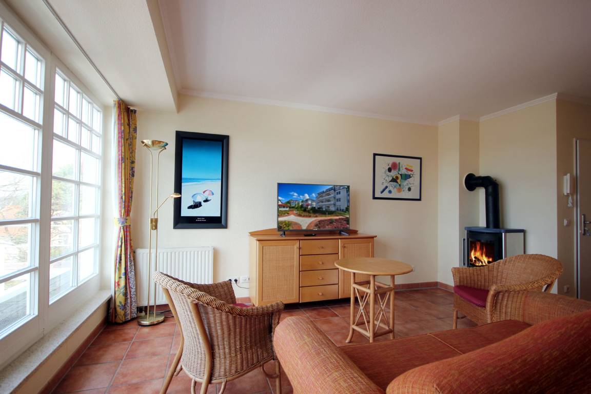 Ihre 3-Zimmer Penthousewohnung 9RB9 Isabell2, mit umlaufender Dachterrasse, die Ihnen im Sommer zu jeder Tageszeit entspannte Sonnenstunden garantiert und Kaminofen im Wohnbereich, der auch in der kalten Jahreszeit kuschelige Stimmung aufkommen lässt, ist ca. 78 qm groß und mit bis zu 4 Personen zu nutzen. Neben dem großzügigen Wohnbereich gibt es zwei separate Schlafräume, Küche, Flur, ein Tageslichtbad mit Waschtisch, Dusche und WC. Ein Schlafraum ist mit einem großen Doppelbett und einem Kleiderschrank ausgestattet. Der zweite Schlafraum verfügt über ein Schlafsofa für zwei weitere Personen, einen Kleiderschrank sowie Zugang zur Dachterrasse. Im Wohnraum gibt es neben dem Kaminofen einen separaten Esstisch und eine Sitzecke mit TV. Die neue Küchenzeile ist mit Geschirrspüler, Mikrowelle, Backofen, Kühlschrank mit kleinem Gefrierfach und diversen Kleingeräten komplett ausgestattet.