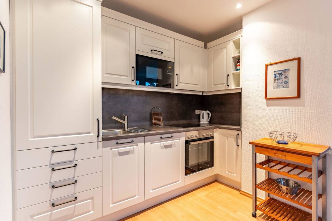 Die im Wohn/Essbereich integrierte offene Küche lässt keine Wünsche offen und sorgt für Wohlfühl-Atmosphäre. Neben Backofen, Geschirrspüler und Gefriermöglichkeit sind natürlich auch Gläser, Besteck und Elektrogeräte vorhanden.