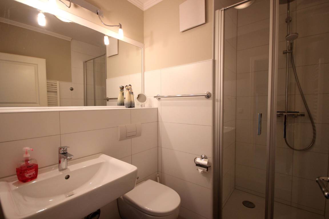 Neben dem lichtdurchfluteten Wohnraum mit integrierter Küche gibt es einen separaten Schlafraum und ein Badezimmer mit Waschtisch, Dusche und WC. Im Schlafraum befindet sich ein Doppelbett und ein Kleiderschrank mit genügend Stauraum. Im Wohnbereich können auf dem Schlafsofa weitere zwei Personen schlafen. Sie finden dort auch einen Flachbild-TV, einen Radio/CD-Spieler und einen kostenlosen Internetzugang. Die Küche ist mit Geschirrspülmaschine, Mikrowelle, Kühlschrank, Backofen, Cerankochfeld, Kaffeemaschine, Wasserkocher und diversen anderen Kleingeräten und Küchenhelfern komplett ausgestattet. Ein wohnungseigener Garagenstellplatz (Duplexparker – 1,50 m hoch) gehört zur Wohnung.