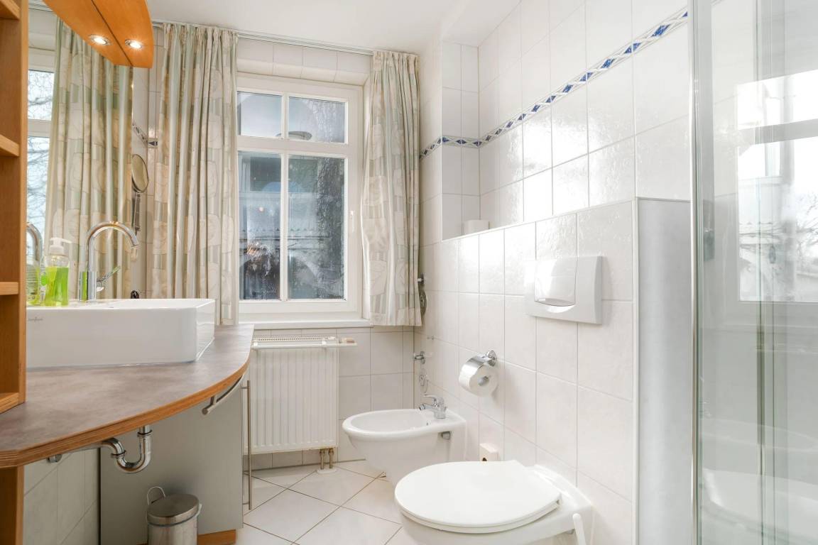 Das Badezimmer ist eine kleine Wohlfühloase: Es verfügt über ein großes Fenster (Tageslichtbad), eine geräumige Dusche, ein WC sowie ein Bidet. Die hellen Fliesen und das moderne Interieur sorgen für einen frischen Start in den Tag.