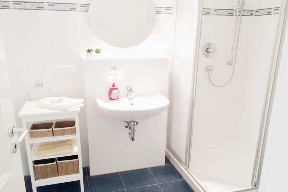 Bad mit geräumiger Dusche, WC, Waschtisch