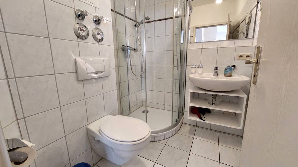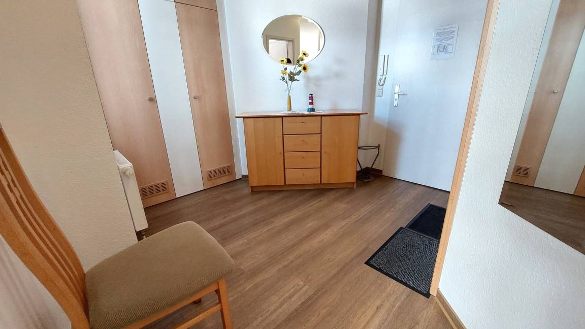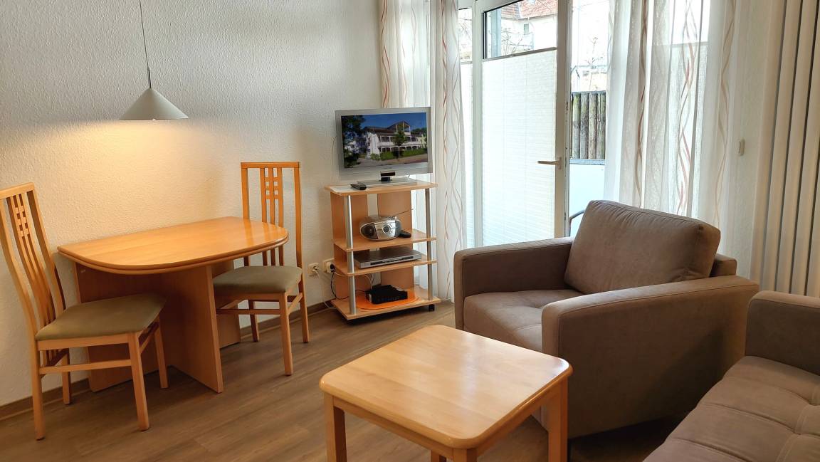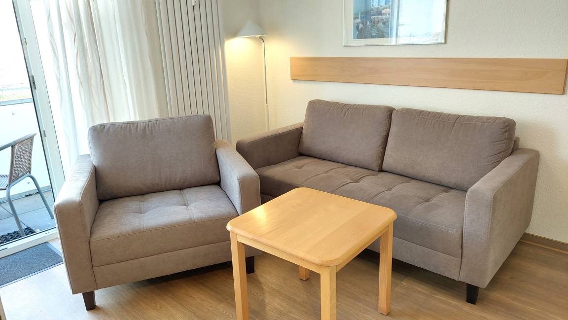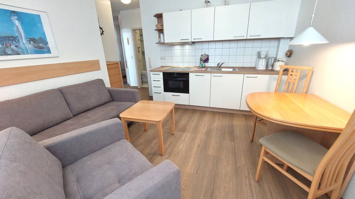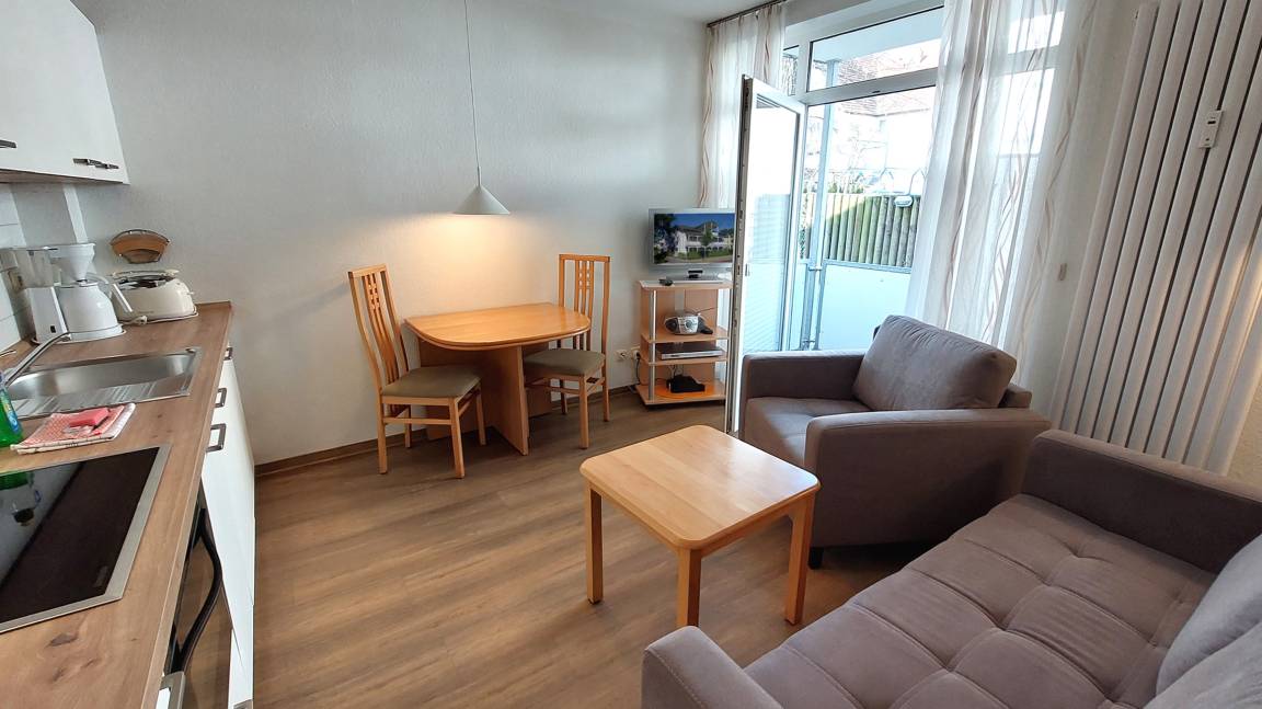Ihre Nichtraucher-Ferienwohnung 90346 befindet sich im Erdgeschoss des Hauses Residenz Dünenstraße. Die 2 Zimmer - Wohnung hat eine Größe von ca. 38 qm und ist mit bis zu 2 Personen belegbar. [nbsp]Neben dem Wohn- und Essbereich mit Sitzecke gibt es ein separates Schlafzimmer, eine Küchenzeile sowie ein Badezimmer mit Waschtisch, Dusche/WC, Kosmetikspiegel und Fön. Das Schlafzimmer verfügt über ein Doppelbett, einen Kleiderschrank, ein Flachbildfernseher sowie Radiowecker. Im Wohnraum gibt es eine gemütliche Sitzecke mit Kabel-TV, WLAN und Musik-Anlage sowie einen gesonderten Essplatz Die Küchenzeile ist mit einem Backofen, Kühlschrank, Kochfeld, Mikrowelle, Kaffeemaschine, Wasserkocher, Toaster und diversen Kleingeräten ausgestattet. Ein geschützter in Richtung Nordwest ebenerdiger Balkon schließt sich dem Wohnbereich an. Ein wohnungseigener Außenstellplatz (Nr. 6) steht Ihnen an der Residenz zur Verfügung. Ihr Haustier ist in dieser Wohnung herzlich willkommen.