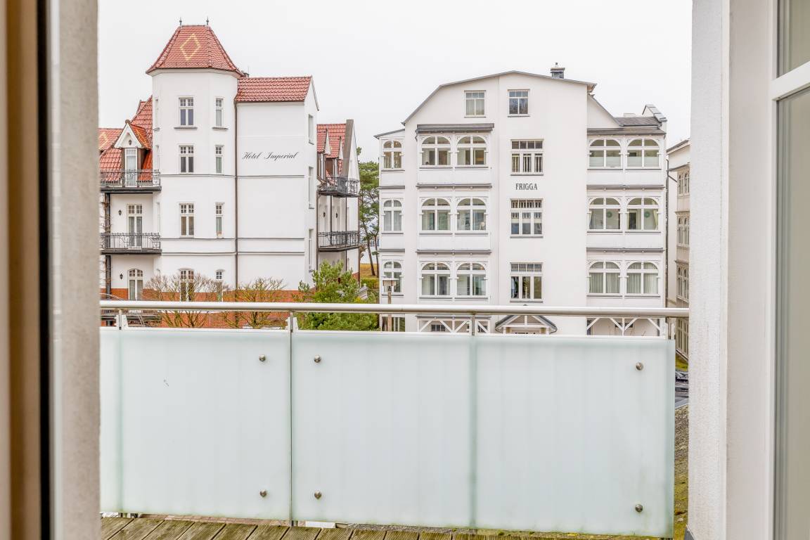 Von der Küche sowie auch vom Wohnbereich aus können Sie die traumhaft schöne Eck-Dachterrasse betreten, die seit Neuestem auch einen verglasten Sicht- und Windschutz hat. So können Sie entspannt und in Ruhe aus von Ihrem „Adlerhorst" die Meeresfrische über den Dächern von Binz genießen, sogar mit etwas Meerblick, durch die imposanten Villen der Strandpromenade.