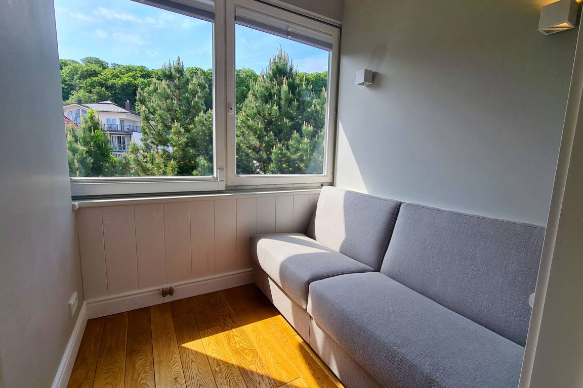 Ihre stilvoll eingerichtete 2,5 - Raum - Meerblickwohnung 40RB32 (Nichtraucher) mit einer Größe von ca. 75 qm liegt im 2. Obergeschoss der Villa und ist mit bis zu 4 Personen belegbar. Das hochwertig möblierte Appartement besticht durch seine hervorragende Lage. Der lichtdurchflutete, großzügige Wohnbereich bietet Ihnen eine gemütliche Sitzgruppe, Flachbild-TV, Sonos-Soundsystem, WLAN, einen separaten Essbereich und den direkten Zugang zum Balkon in Richtung Ostsee. An den Wohnbereich schließt die offene Wohnküche an, die mit Geschirrspüler, Kühl- / Gefrierkombination, Backofen, Cerankochfeld, Kaffeemaschine, Wasserkocher, Toaster und diversen anderen Küchenhelfern komplett ausgestattet ist. Im Hauptschlafraum befindet sich ein bequemes Boxspringbett (180x200) und ein großer Kleiderschrank mit genügend Stauraum. Der 2. Schlafraum im angrenzendem Wintergarten erwartet Sie mit einem Schlafsofa. Im modernen Badezimmer finden Sie neben Waschtisch, Dusche und WC auch einen Handtuchheiztrockner. Ein wohnungseigener Stellplatz (Doppelparker Einfahrtshöhe max.1,70m) steht Ihnen direkt an der Villa zur Verfügung. Rundum eine schön eingerichtete Wohnung, die zum Entschleunigen einlädt. Genießen Sie Ihren Urlaub und machen Sie diese Wohnung zu Ihrem zweiten Zuhause!