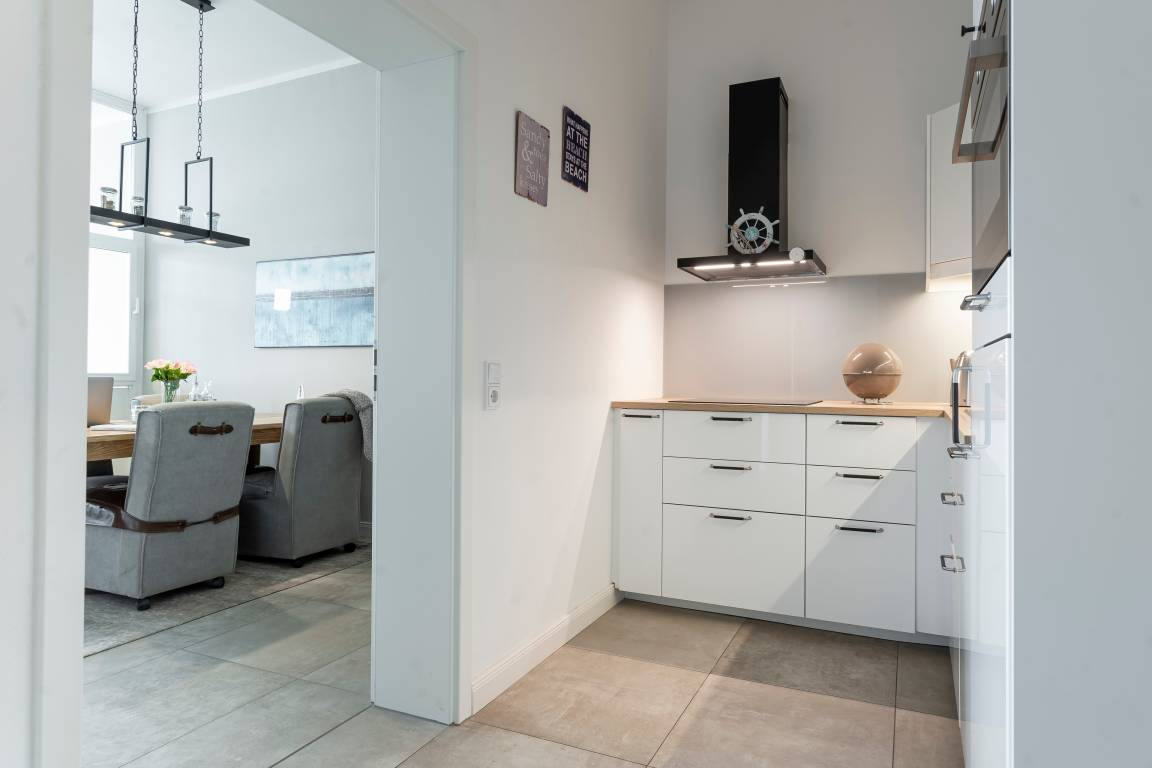 Unser Appartement 11 befindet sich im 1. Obergeschoss und verfügt mit seinen 90 m² über ein Wohn- und Esszimmer, ein Schlafzimmer mit Zugang zu einem großen Balkon mit Meerblick, eine vollausgestattete Küchenzeile und ein geräumiges Duschbad.