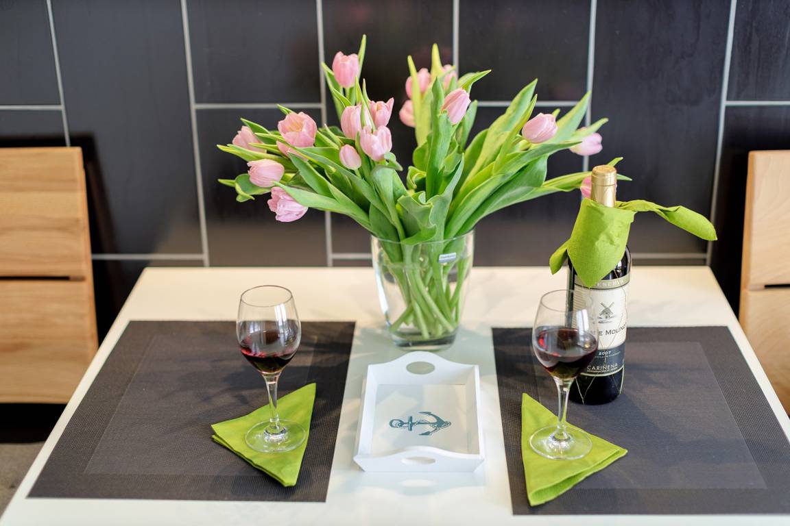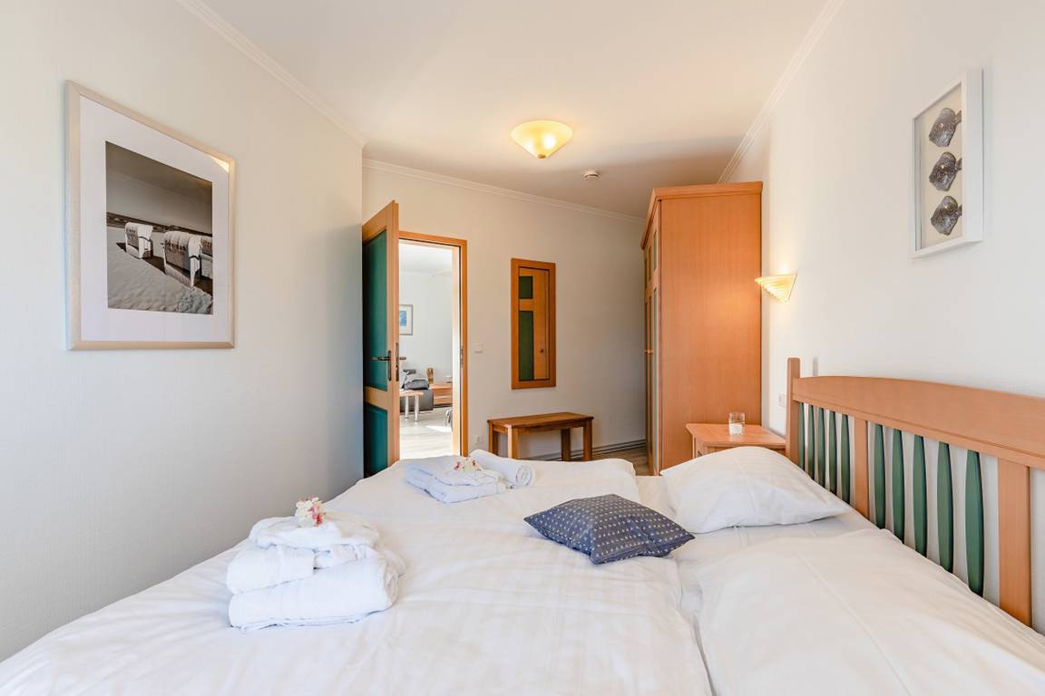 Ihre mit Liebe zum Detail ausgestattete 2-Raum Ferienwohnung 16RB196 (Nichtraucher) hat eine Größe von ca. 54 qm und ist für max. 3 Personen eingerichtet. Sie befindet sich im 2. Obergeschoss (Endetage) und verfügt über einen Südbalkon, der zum Verweilen einlädt. Im hellen Wohnbereich mit offener, moderner Küchenzeile und separatem Essbereich finden Sie eine gemütliches Ecksofa (mit Schlaffunktion für eine dritte Person), Smart-TV, Radio und kostenfreiem WLAN. Vom Wohnraum gelangen Sie auf den Südbalkon, der auch für 3 Personen reichlich Platz zum Sitzen oder Sonnen bietet. Das separate Schlafzimmer ist mit einem Doppelbett und einem großen Kleiderschrank ausgestattet. Das mit Granit geflieste Badezimmer umfasst eine Dusche, Waschtisch, WC, Kosmetikspiegel und Fön. Die Küche ist mit Backofen, Kühl-/Gefrierkombination, Geschirrspüler, Kaffeemaschine, Toaster, Wasserkocher und anderen diversen Küchenhelfern komplett ausgestattet. Ein wohnungseigener PKW-Stellplatz steht Ihnen[nbsp] in der Tiefgarage kostenfrei zur Verfügung.