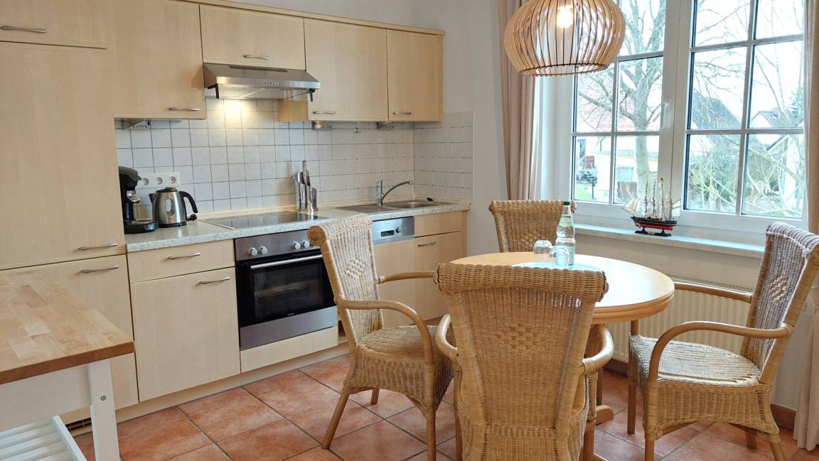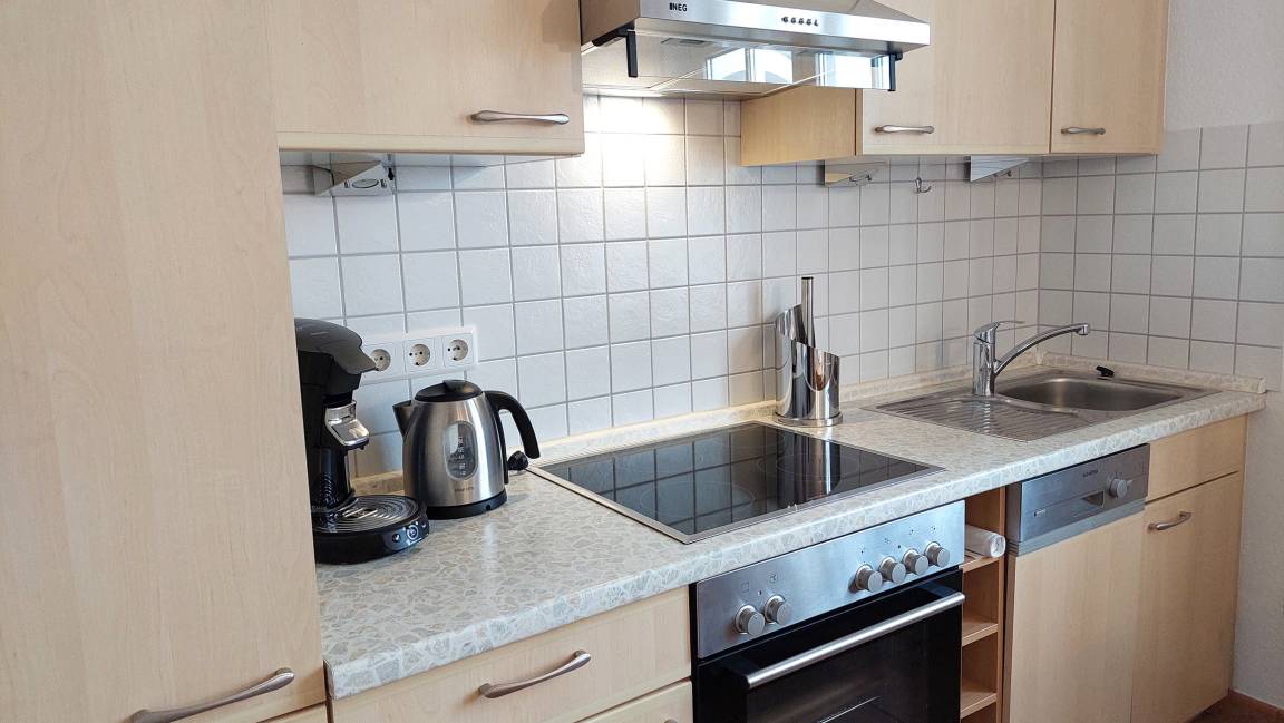 Der Kochbereich läd zur Selbstversorgung ein mit Cerankochfeld, Backofen, Geschirrspüler und Kühlschrank mit Gefrierfach.
