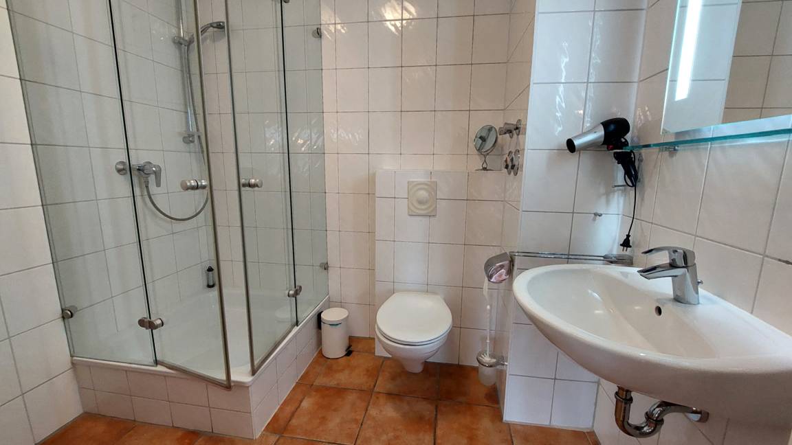 Im Badezimmer befindet sich WC, Dusche, Fön und eine Handtuchheizung,