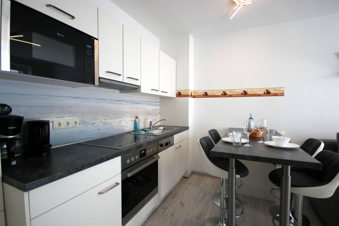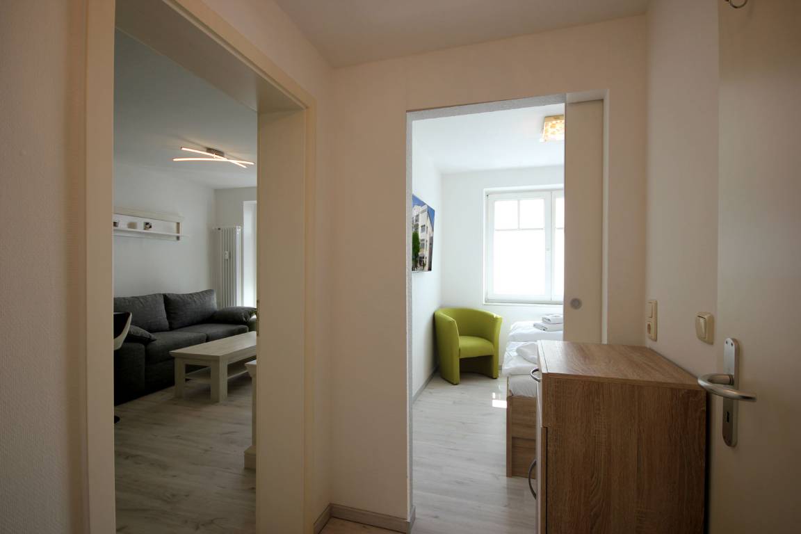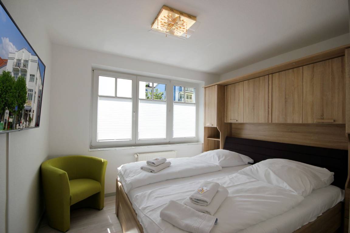 Ihre attraktive 2-Zimmerwohnung 23RB7 hat eine Größe von ca. 38 qm und ist für 4 Personen eingerichtet. Sie befindet sich im Hochparterre und verfügt über einen möblierten Balkon. Dem hellen Wohnraum schließt sich die moderne Wohnküche und der Essbereich an. Im separaten Schlafraum finden Sie ein modernes Doppelbett mit Überbau als zusätzlichen Stauraum sowie einen großen Flachbild-TV. Vom vorgelagerten Flur aus erreichen Sie das Badezimmer mit Waschtisch, Dusche, WC und Fön. Im Wohnraum erwartet Sie eine gemütliche Sitzecke mit Schlaffunktion für die 3. und 4. Person, kostenfreies WLAN sowie einen weiteren Flachbildfernseher. Die Küchenzeile verfügt über einen Backofen, Cerankochfeld, eine Mikrowelle, Kühlschrank, Geschirrspüler, Kaffeemaschine, Toaster und Wasserkocher. Ein kostenloser PKW-Stellplatz steht Ihnen auf dem Parkplatz "Zentrum" (ca. 400 m vom Objekt entfernt) während Ihres Aufenthaltes zur Verfügung.