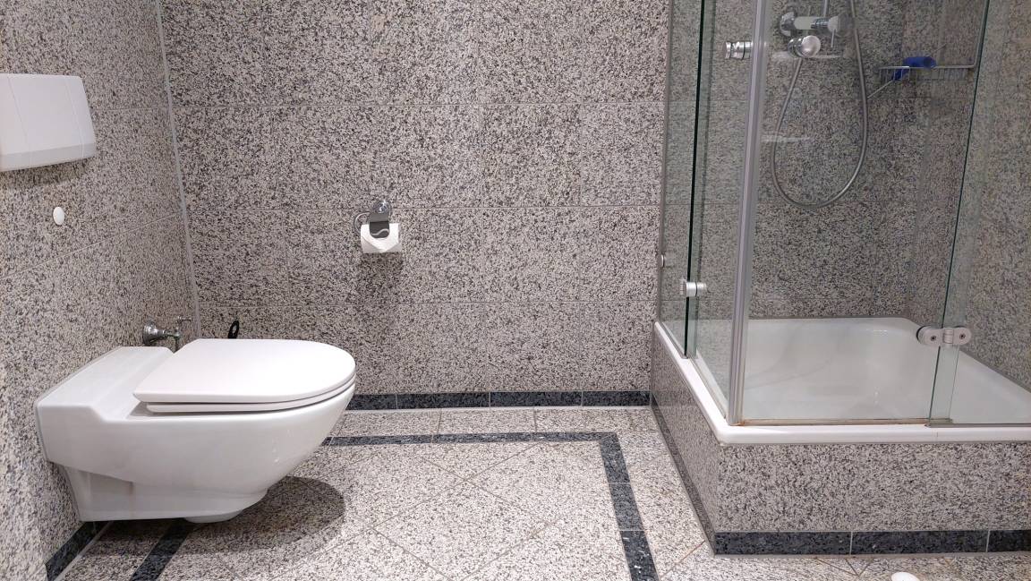 Das Badezimmer ist in Marmoroptik gehalten und verfügt über eine Toilette, einen Waschtisch, eine Dusche, einen Kosmetikspiegel, Fön und Zugang zum Ankleidezimmer mit viel Stauraum.