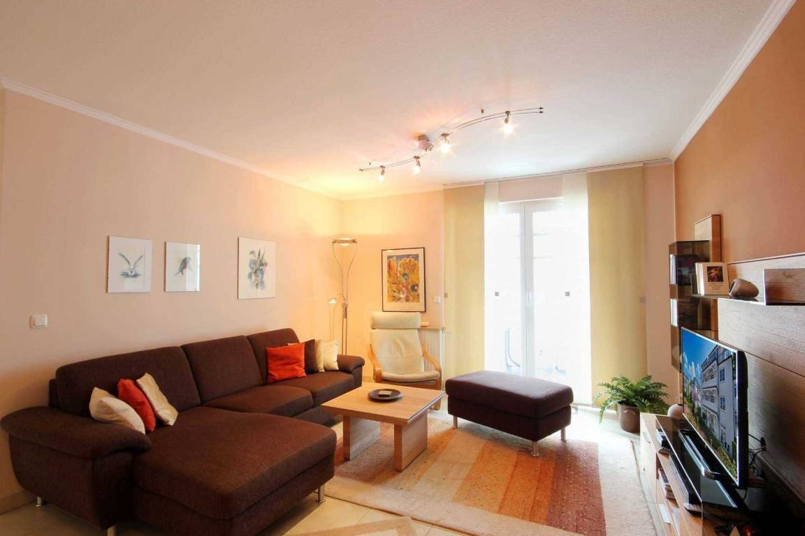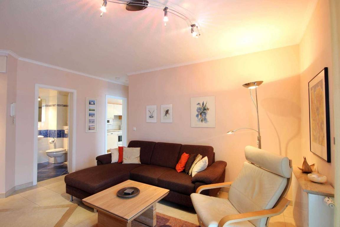 Im Wohnraum kann auf dem Schlafsofa eine weitere Person schlafen. Außerdem finden Sie im modernen Wohnbereich einen Schwingsessel, Flachbild - TV, einen DVD-Recorder sowie einen kostenfreien WLAN-Zugang. Die moderne Küche ist mit Geschirrspülmaschine, Backofen, Mikrowelle, Kühlschrank und diversen Kleingeräten ausgestattet. Einen schönen Süd-Westbalkon befindet sich vor dem Wohnraum.