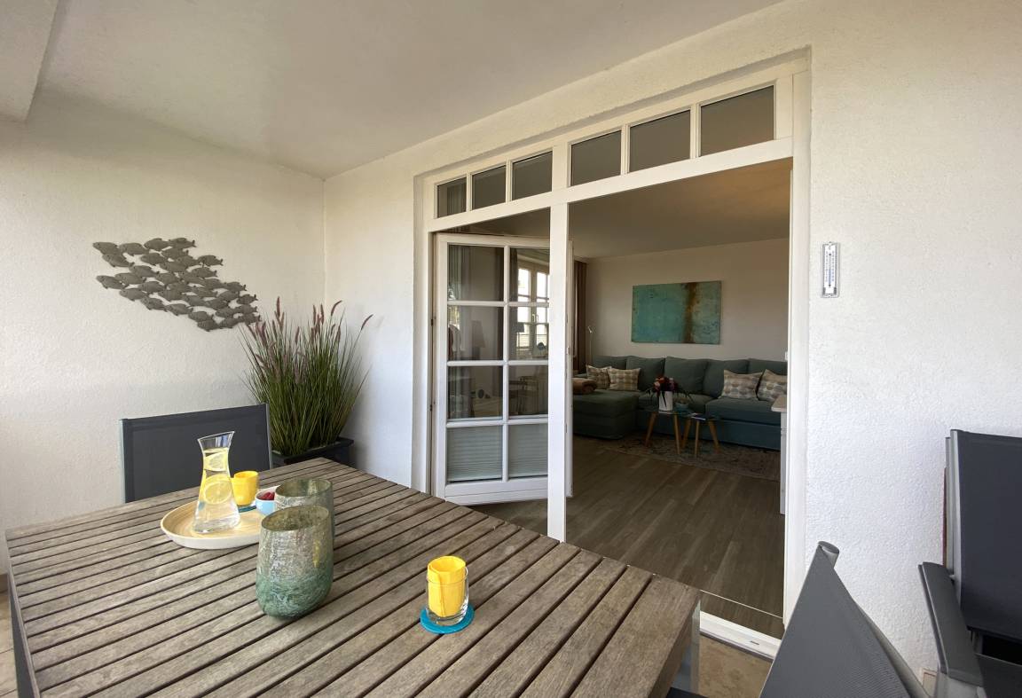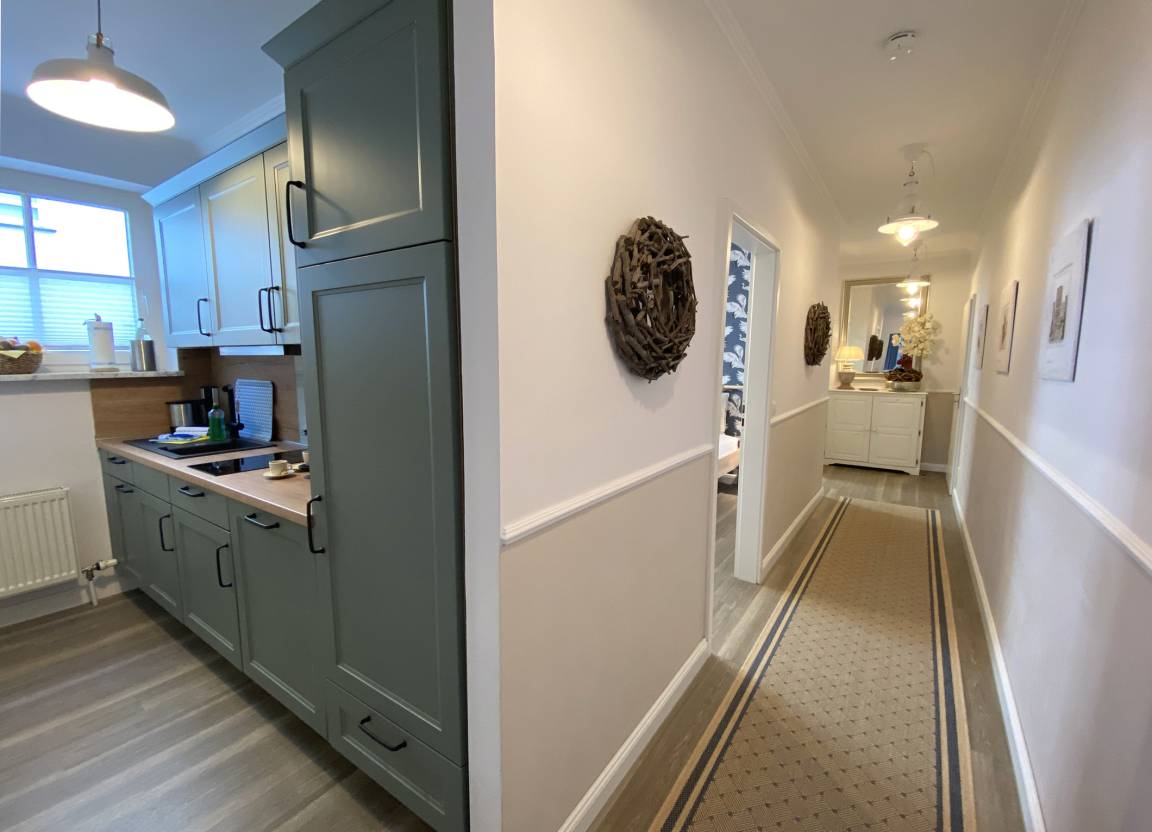 Die mit Liebe zum Detail ausgestattete 2-Raumwohnung bereitet durch seine hochwertige und moderne Ausstattung einen besonders angenehmen Aufenthalt. Dieses schöne Appartement gliedert sich auf in einen stilvoll eingerichteten Flur mit Garderobe, einen gemütlichen Wohnraum mit direktem Zugang zum Balkon, eine separate Küche, ein Schlafzimmer und ein Tageslichtbad mit Dusche, Waschtisch, WC und Fön. Das Wohnzimmer ist mit einem Essplatz und einer bequemen Sitzgruppe, die auch eine zusätzliche Schlafmöglichkeit für zwei weitere Personen bietet, möbliert. Darüber hinaus bereitet die angenehme Liegefläche von 1,40 m x 2,00 m und die zusätzlichen Verdunklungsstoffe ein angenehmes Schlafambiente. Für ein komfortables Sitzen am Tage dient ein Bettkasten als Verstaumöglichkeit für die Federkissen und Mikrofaserdecken.