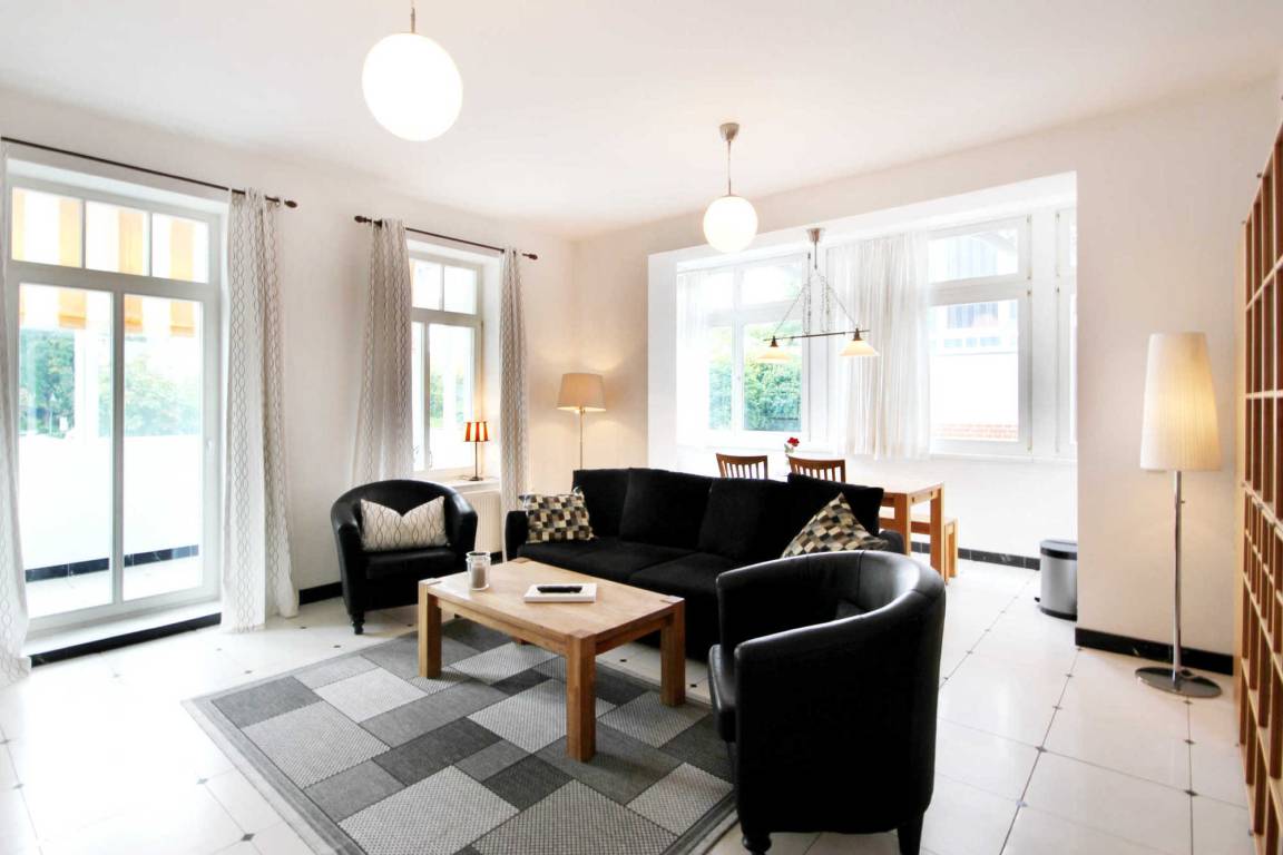 Ihre moderne 2-Raum-Meerblickwohnung 30RB8 (Nichtraucher) mit einer Größe von ca. 70 qm befindet sich im 1. OG der Villa. Sie ist mit bis zu 4 Personen belegbar. In dem Wintergarten (Südwesten) können Sie Ihren Urlaubstag bei Abendsonne Revue passieren lassen. Die hochwertige Ausstattung der Unterkunft trägt zur Entschleunigung bei. Neben dem Wohnbereich mit integrierter Küche und Essbereich, gibt es einen separaten Schlafraum und ein Badezimmer mit Waschtisch, Dusche und WC. Im Schlafzimmer befindet sich ein Doppelbett, ein Kleiderschrank und ein Flachbildfernseher. Die Glasloggia erreichen Sie über den Wohnraum, in dem sich auch ein Schlafsofa für die 3. und 4. Person befindet, ein Flachbild-TV, einen kostenfreien WLAN-Zugang und Hifianlage. Die Küche ist mit Geschirrspülmaschine, Ceranfeld, Backofen, Mikrowelle, Kühlschrank, Kaffeemaschine, Wasserkocher, Toaster und diversen anderen Küchenhelfern komplett ausgestattet. Ihr Vierbeiner ist hier herzlich willkommen!