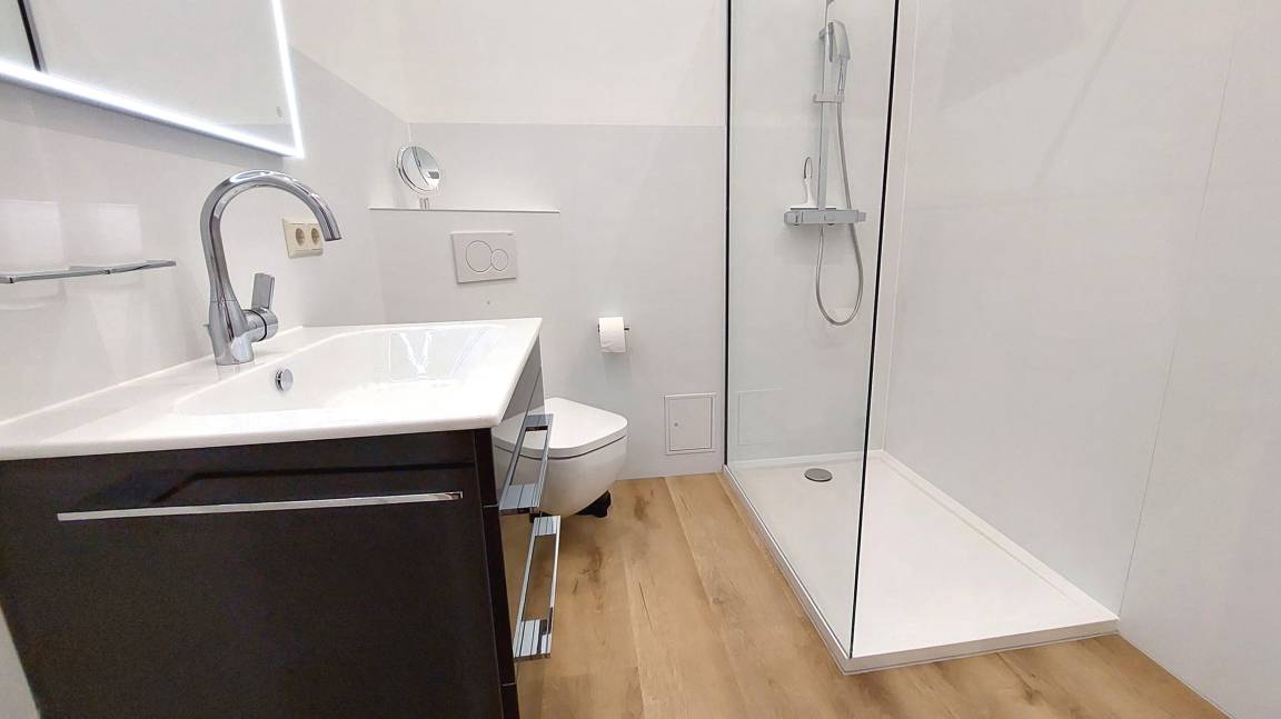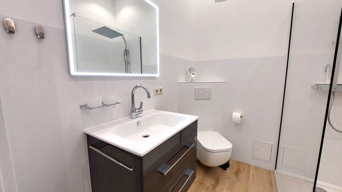Das geräumige Badezimmer verfügt über eine Dusche, WC und Waschtisch sowie über einen Hocker, einen Fön und viel Ablagefläche.