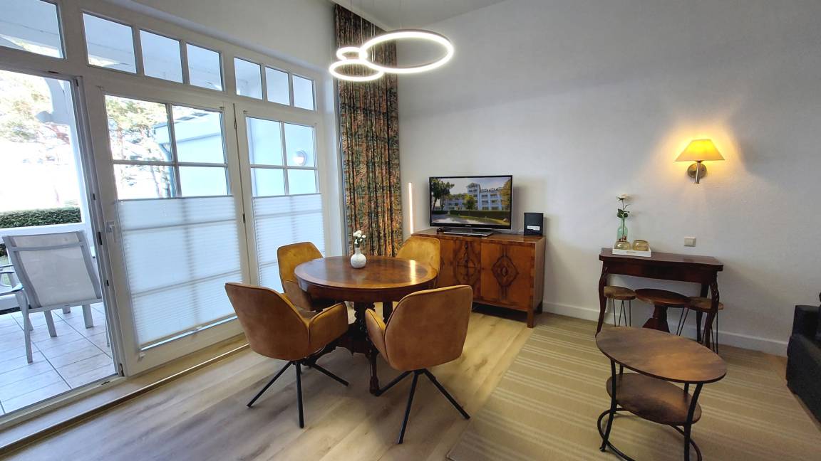 Das Wohnzimmer verfügt über einen hochwertigen Essbereich, 2 Sessel, Smart-TV und ein gemütliches Sofa (mit Schlaffunktion für 2 weitere Personen).