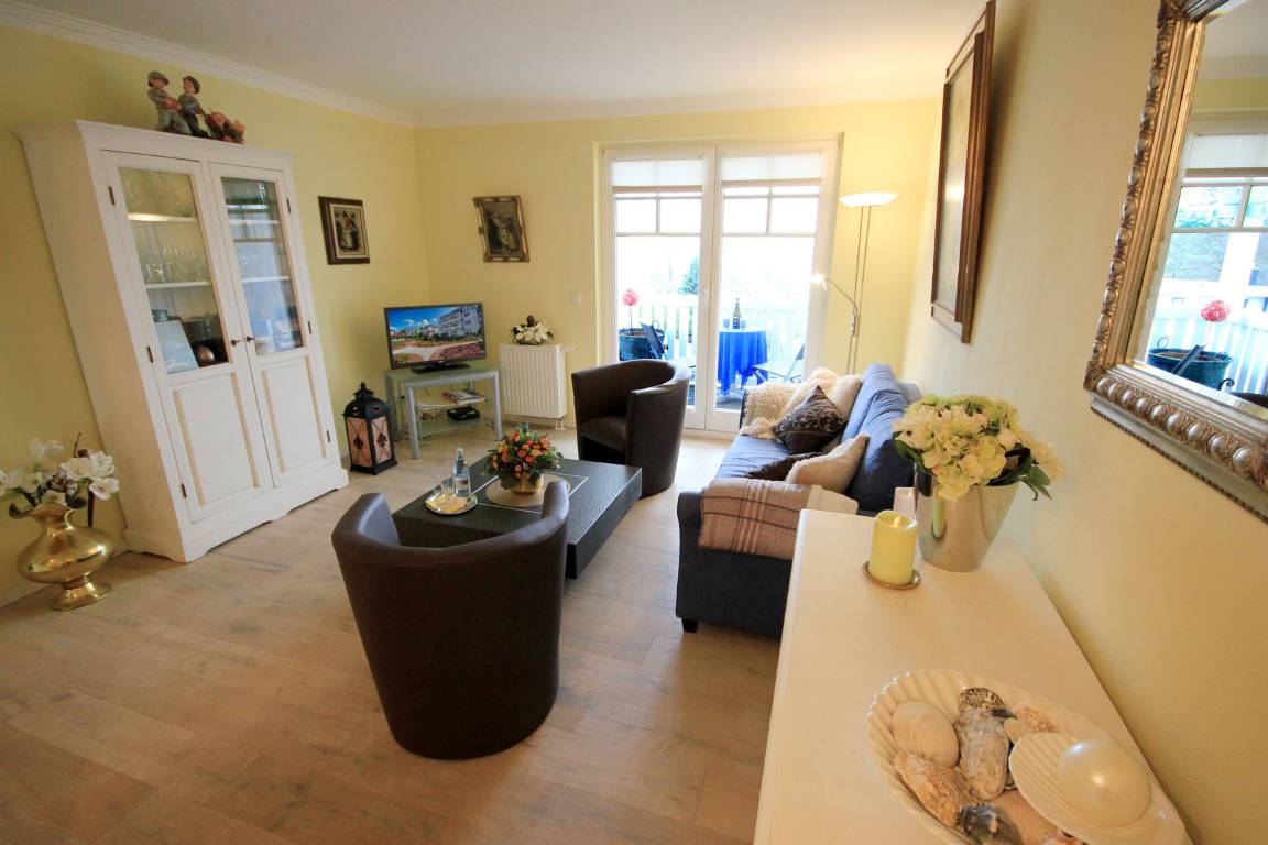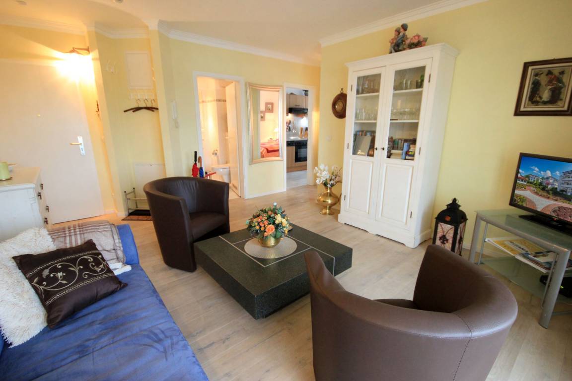 Ihre gemütliche Ferienwohnung 9RB7 in der Villa Grieben befindet sich in der ersten Etage des Hauses. Die 2 Zimmerwohnung verfügt über ca. 48 qm und ist mit bis zu 4 Personen belegbar. Vom überdachten und in Richtung Südwest gelegenen Balkon genießen Sie einen weiten Blick über die Dächer von Binz. Neben dem Wohnraum gibt es eine separate Küche, ein Schlafzimmer sowie ein Duschbad mit Waschbecken und WC. Der Schlafraum ist mit einem Doppelbett (1,60m x 2m) und einem großen Kleiderschrank ausgestattet. Im Wohnraum mit Zugang zum Balkon bietet eine Schlafcouch eine weitere Schlafmöglichkeit für zwei Personen. Außerdem finden Sie im modernen Wohnbereich zwei bequeme Sessel, einen Flachbild – TV sowie einen kostenfreien WLAN-Zugang. Die separate Küche begrüßt Sie mit einer komplett ausgestatteten Küchenzeile u.a. mit Geschirrspüler, Backofen, Mikrowelle, Kühlschrank, Gefrierschrank, ausreichend Geschirr und diversen Kleingeräten.