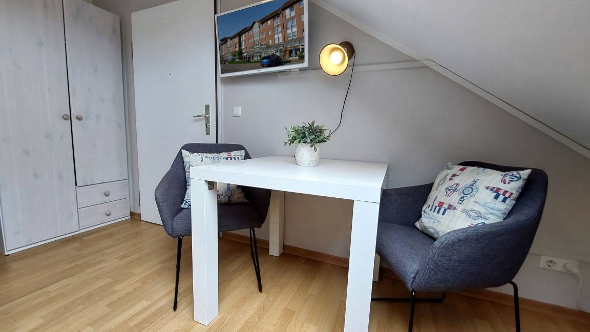 Das schicke Microappartement 90604 im 4. Obergeschoss wurde im Frühjahr 2019 komplett neu renoviert. Entstanden ist ein kleines gemütliches Wohnnest über den Dächern von Binz. Die Dachschrägen sind charakteristisch für das nur ca. 10 qm große Studio. Dennoch finden Sie alles vor, was man für einen gemütlichen Aufenthalt braucht. Das Studio verfügt maßgeschneidertes Doppelbett samt Stauraum, einen kleinen Ess- und Arbeitstisch mit zwei gemütlichen Stühlen und Fusshockern, sowie eine Miniküche mit Spüle, Kühlschrank mit Gefrierfach. 2-Plattenherd und Mikrowelle. Ein Kleiderschrank mit Safe und ein Flatscreen-TV runden das Angebot ab. Freies WLAN ist ebenfalls vorhanden. Das separate Duschbad mit Waschtisch und WC komplettiert das Studio.