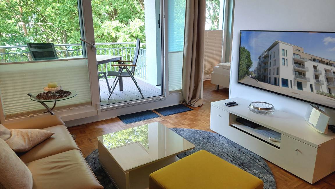 Die Unterkunft umfasst zirka 65 qm, bietet Platz für bis zu 4 Personen und ist von Tiefgarage und Erdgeschoss bequem per Fahrstuhl erreichbar.