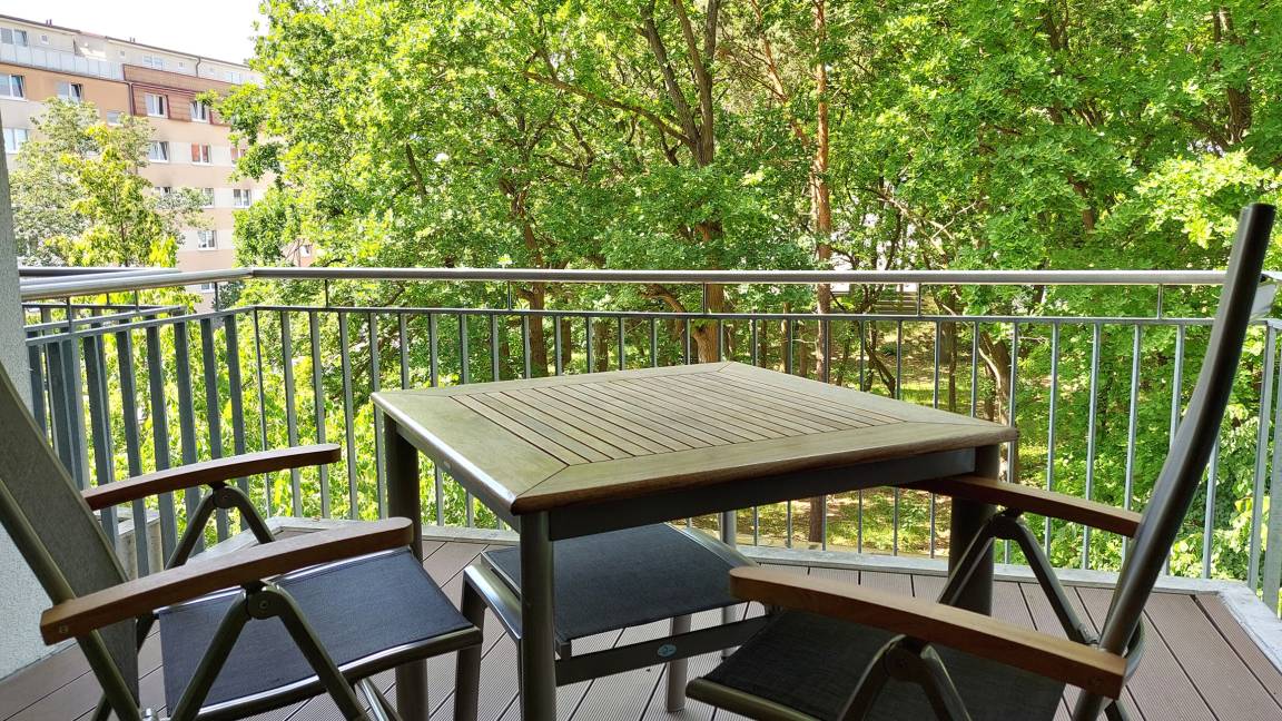 Der möblierte Balkon Richtung Nordwesten liefert einen schönen Blick ins Grüne.