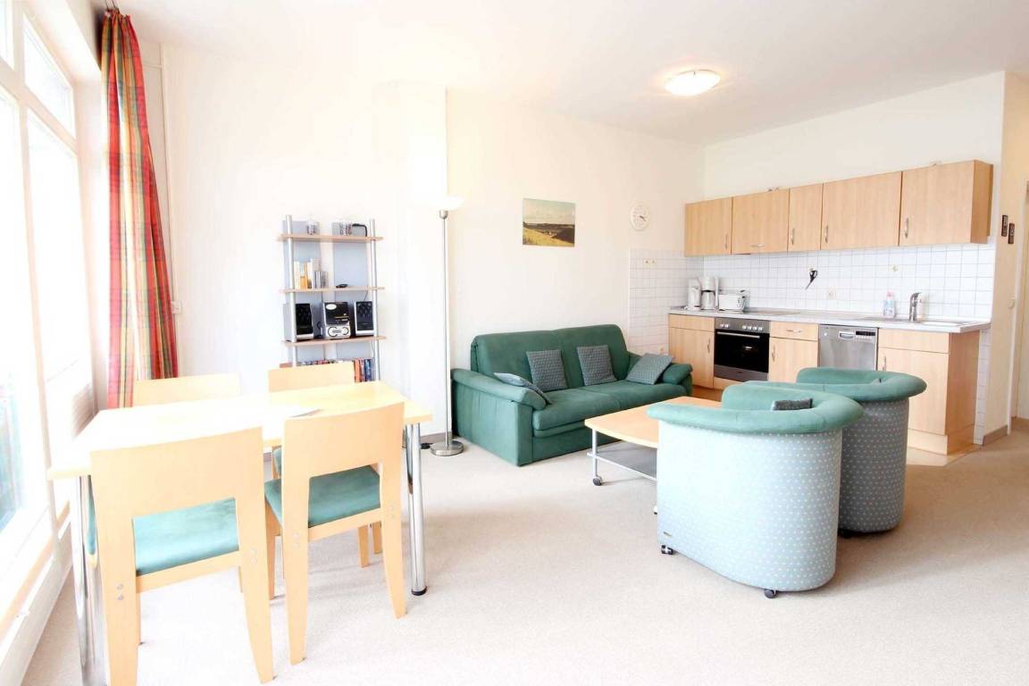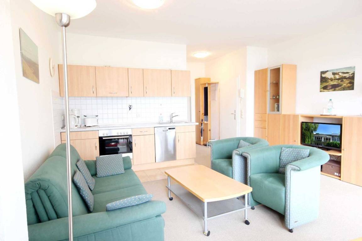 Ihre 2-Raum-Nichtraucher-Ferienwohnung 37RB14 hat eine Größe von ca. 52 qm und ist mit bis zu 4 Personen belegbar. Sie befindet sich im 1. Obergeschoss und verfügt über einen großen Südbalkon, von dem Sie einen wunderschönen Panoramablick auf den Schmachter See haben. Die Ferienwohnung ist aufgeteilt in einen gemütlichen Wohnraum mit separatem Essbereich, eine offene moderne Küche, ein Schlafzimmer und ein Duschbad mit Waschtisch, Fön und WC. Das Wohnzimmer ist mit einem Essplatz und einer Sitzgruppe, die auch eine Schlafgelegenheit für die 3. und 4. Person bietet, möbliert. Die technische Ausstattung beinhaltet ein Flachbildfernseher und einen Radio/CD-Spieler. Die Küche ist mit Kühlschrank, Geschirrspüler, Backofen, Cerankochfeld und weiteren Elektrogeräten komplett ausgestattet. Das Schlafzimmer verfügt über ein Doppelbett und einen Kleiderschrank. Ein PKW-Stellplatz steht Ihnen auf dem Parkplatz „Zentrum" (ca. 300m vom Objekt entfernt) kostenfrei zur Verfügung sowie ein kostenloser Internetzugang während Ihres Aufenthaltes.